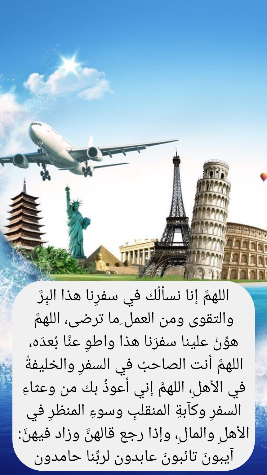 - اللهم يا حافظ يا كريم، أسألك في سفري هذا أن تحفظني بحفظك الذي لا يرام، وأن تكلأني بعينك التي لا تنام، وأن تهديني إلى ما فيه الخير والصلاح.