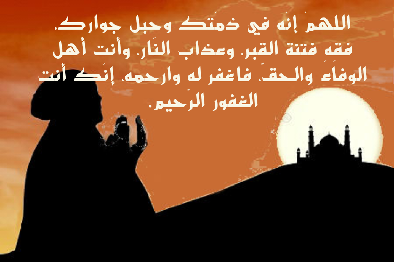 “اللَّهُمَّ، اغْفِرْ لَهُ وَارْحَمْهُ وَعَافِهِ وَاعْفُ عَنْهُ، وَأَكْرِمْ نُزُلَهُ، وَوَسِّعْ مُدْخَلَهُ، وَاغْسِلْهُ بِالْمَاءِ وَالثَّلْجِ وَالْبَرَدِ، وَنَقِّهِ مِنَ الْخَطَايَا كَمَا نَقَّيْتَ الثَّوْبَ الْأَبْيَضَ مِنَ الدَّنَسِ، وَأَبْدِلْهُ دَارًا خَيْرًا مِنْ دَارِهِ، وَأَهْلًا خَيْرًا مِنْ أَهْلِهِ وَزَوْجًا خَيْرًا مِنْ زَوْجِهِ، وَأَدْخِلْهُ الْجَنَّةَ وَأَعِذْهُ مِنْ عَذَابِ الْقَبْرِ، أَوْ مِنْ عَذَابِ النَّارِ” (رواه مسلم).