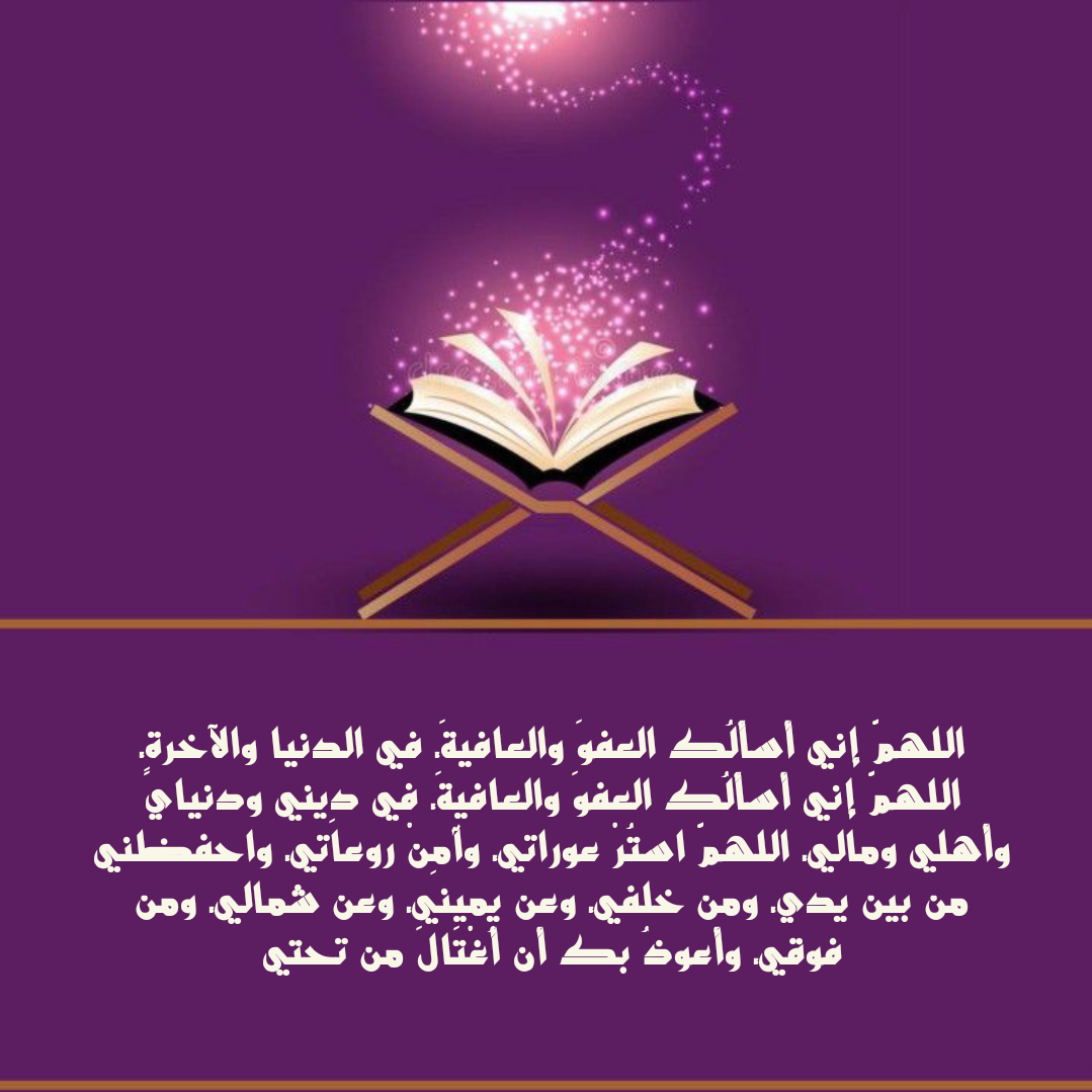 “اللَّهُمَّ إِنِّي أَسْأَلُكَ الْعَفْوَ وَالْعَافِيَةَ فِي الدُّنْيَا وَالآخِرَةِ، اللَّهُمَّ إِنِّي أَسْأَلُكَ الْعَفْوَ وَالْعَافِيَةَ فِي دِينِي وَدُنْيَايَ وَأَهْلِي وَمَالِي، اللَّهُمَّ اسْتُرْ عَوْرَاتِي، وَآمِنْ رَوْعَاتِي، اللَّهُمَّ احْفَظْنِي مِنْ بَيْنِ يَدَيَّ، وَمِنْ خَلْفِي، وَعَنْ يَمِينِي، وَعَنْ شِمَالِي، وَمِنْ فَوْقِي، وَأَعُوذُ بِعَظَمَتِكَ أَنْ أُغْتَالَ مِنْ تَحْتِي”.