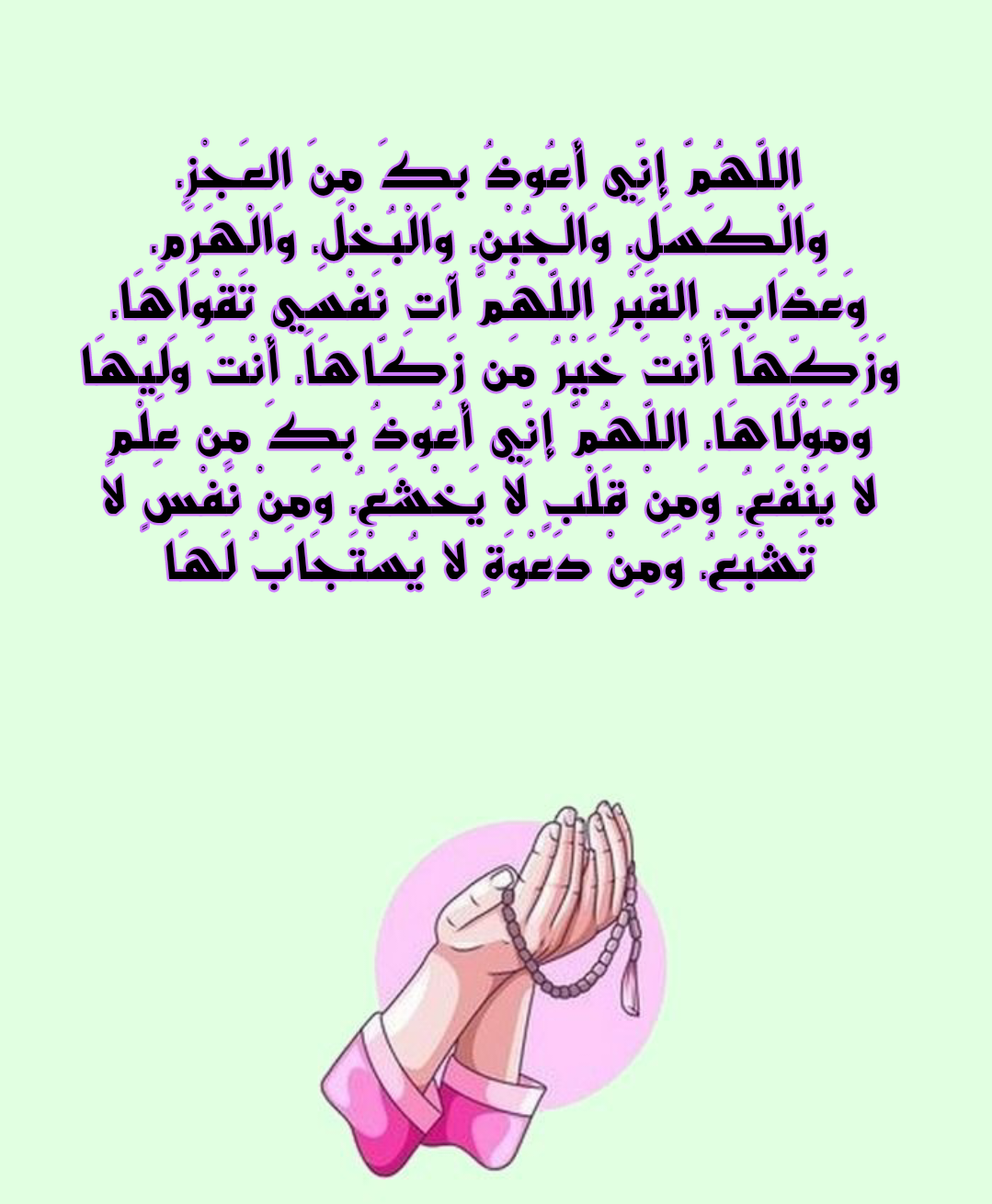 - “اللَّهُمَّ اسْتُرْنَا فَوْقَ الأَرْضِ، وَتَحْتَ الأَرْضِ، وَيَوْمَ الْعَرْضِ عَلَيْكَ، اللَّهُمَّ اشْفِ مَرْضَانَا وَمَرْضَى الْمُسْلِمِينَ، وَارْحَمْ مَوْتَانَا وَمَوْتَى الْمُسْلِمِينَ، وَاقْضِ حَوَائِجَنَا وَحَوَائِجَ السَّائِلِينَ”.