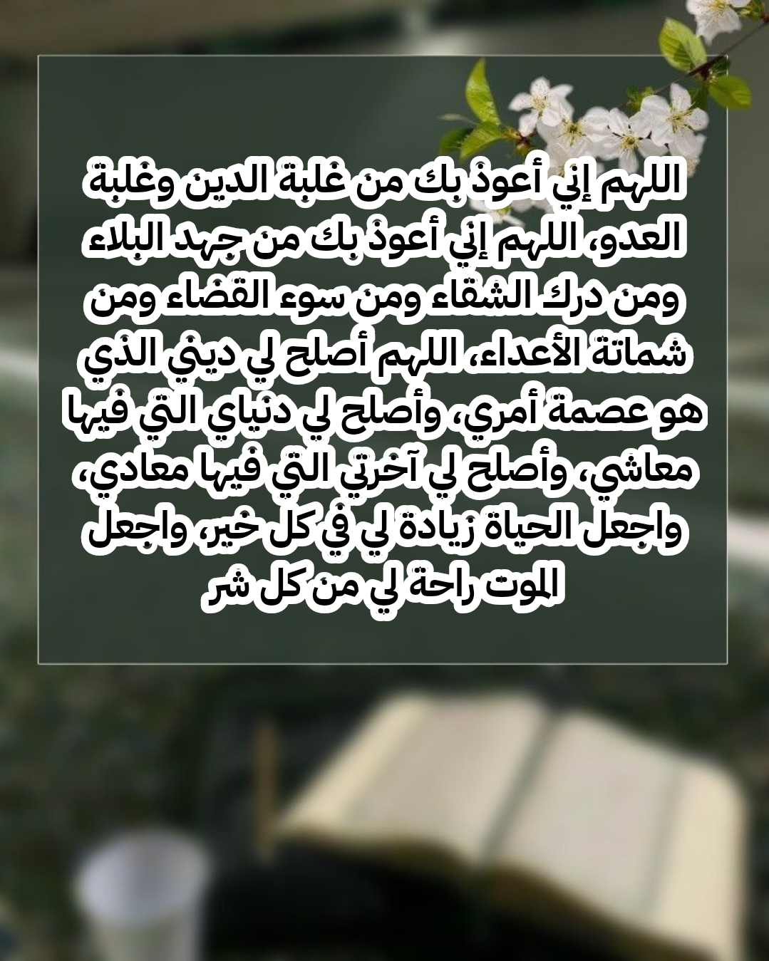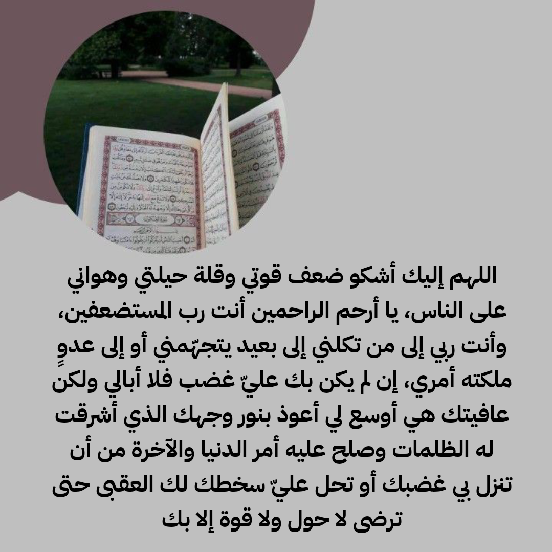 • اللَّهُمَّ إِنِّي أَشْكُو إِلَيْكَ ضَعْفَ قُوَّتِي وَقِلَّةَ حِيلَتِي، فَأَنْتَ حَسْبِي فِي كُلِّ ضِيقٍ، وَأَنْتَ مَلْجَأِي فِي كُلِّ كَرْبٍ، اللَّهُمَّ اكْشِفْ عَنِّي هَمِّي، وَأَبْعِدْ عَنِّي شَرَّ مَنْ أَرَادَ بِي سُوءًا، اللَّهُمَّ قَوِّنِي بِقُوَّتِكَ، وَكُنْ لِي نَصِيرًا فِي كُلِّ حِينٍ.