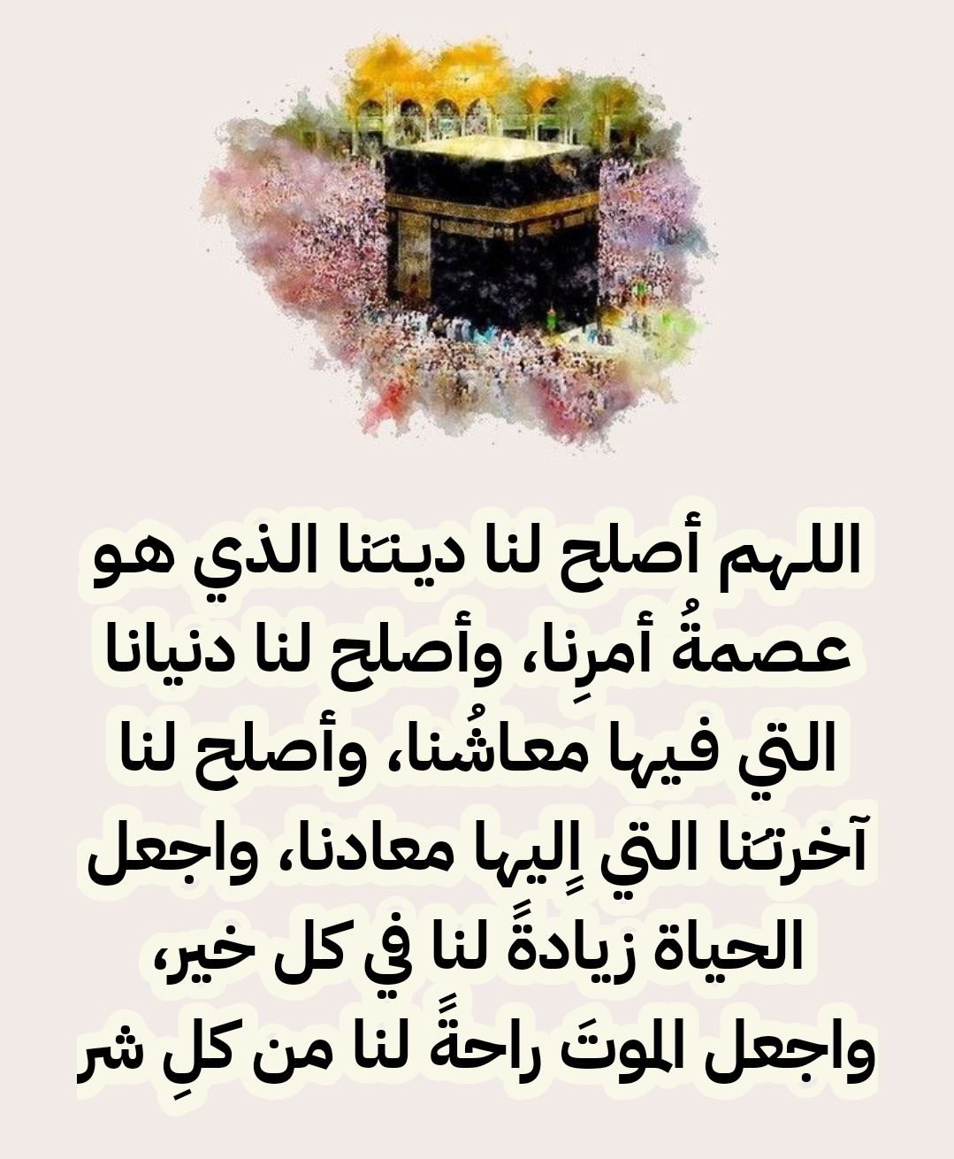 عن أبي هريرة رضي الله عنه قال: كان رسول الله صلى الله عليه وسلم يقول:“اللَّهُمَّ أَصْلِحْ لِي دِينِي الَّذِي هُوَ عِصْمَةُ أَمْرِي، وَأَصْلِحْ لِي دُنْيَايَ الَّتِي فِيهَا مَعَاشِي، وَأَصْلِحْ لِي آخِرَتِي الَّتِي فِيهَا مَعَادِي، وَاجْعَلِ الْحَيَاةَ زِيَادَةً لِي فِي كُلِّ خَيْرٍ، وَاجْعَلِ الْمَوْتَ رَاحَةً لِي مِنْ كُلِّ شَرٍّ”