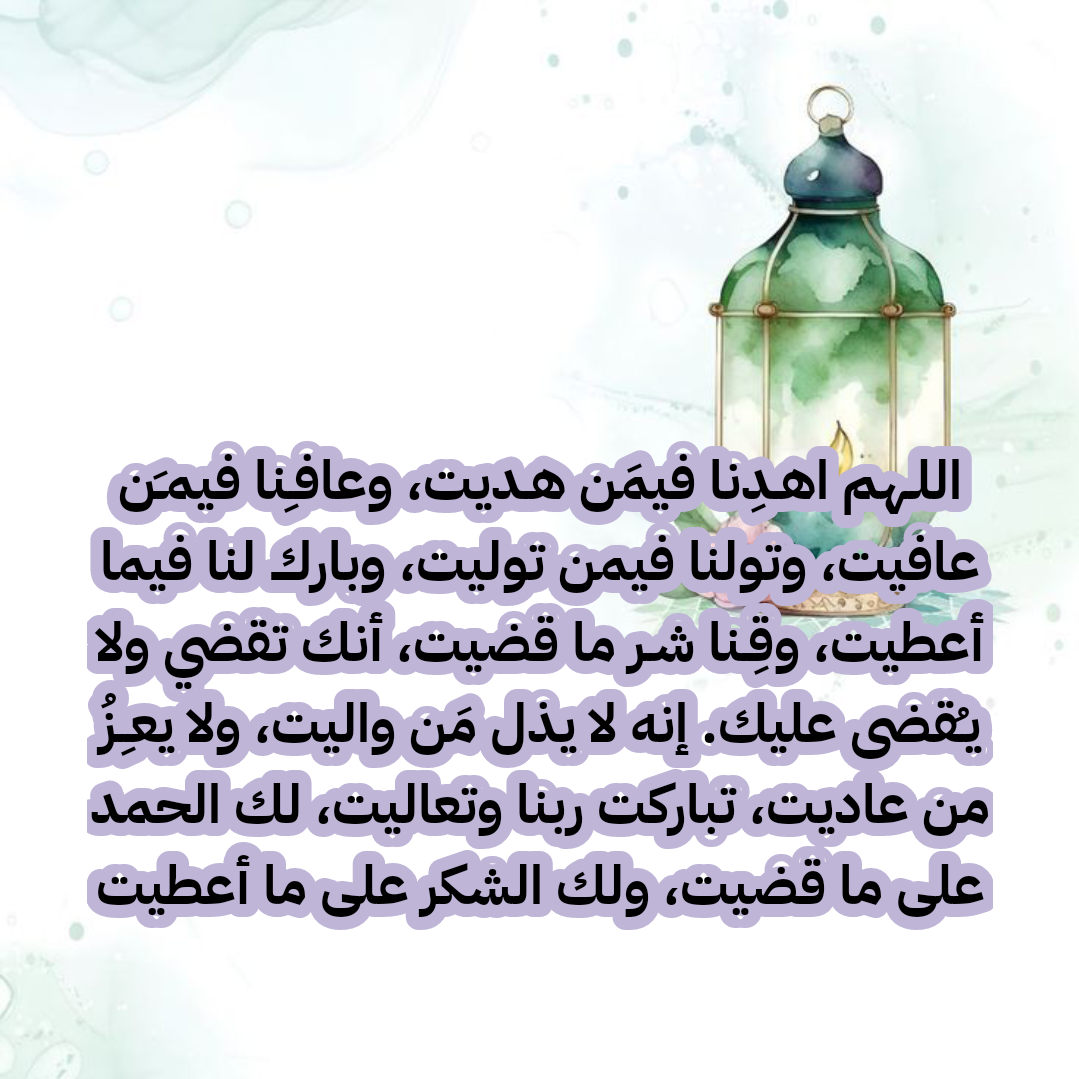 عن الحسن بن علي رضي الله عنهما قال: علمني رسول الله صلى الله عليه وسلم كلمات أقولهن في قنوت الوتر:“اللَّهُمَّ اهْدِنِي فِيمَنْ هَدَيْتَ، وَعَافِنِي فِيمَنْ عَافَيْتَ، وَتَوَلَّنِي فِيمَنْ تَوَلَّيْتَ، وَبَارِكْ لِي فِيمَا أَعْطَيْتَ، وَقِنِي شَرَّ مَا قَضَيْتَ، فَإِنَّكَ تَقْضِي وَلَا يُقْضَى عَلَيْكَ، وَإِنَّهُ لَا يَذِلُّ مَنْ وَالَيْتَ، وَلَا يَعِزُّ مَنْ عَادَيْتَ، تَبَارَكْتَ رَبَّنَا وَتَعَالَيْتَ”