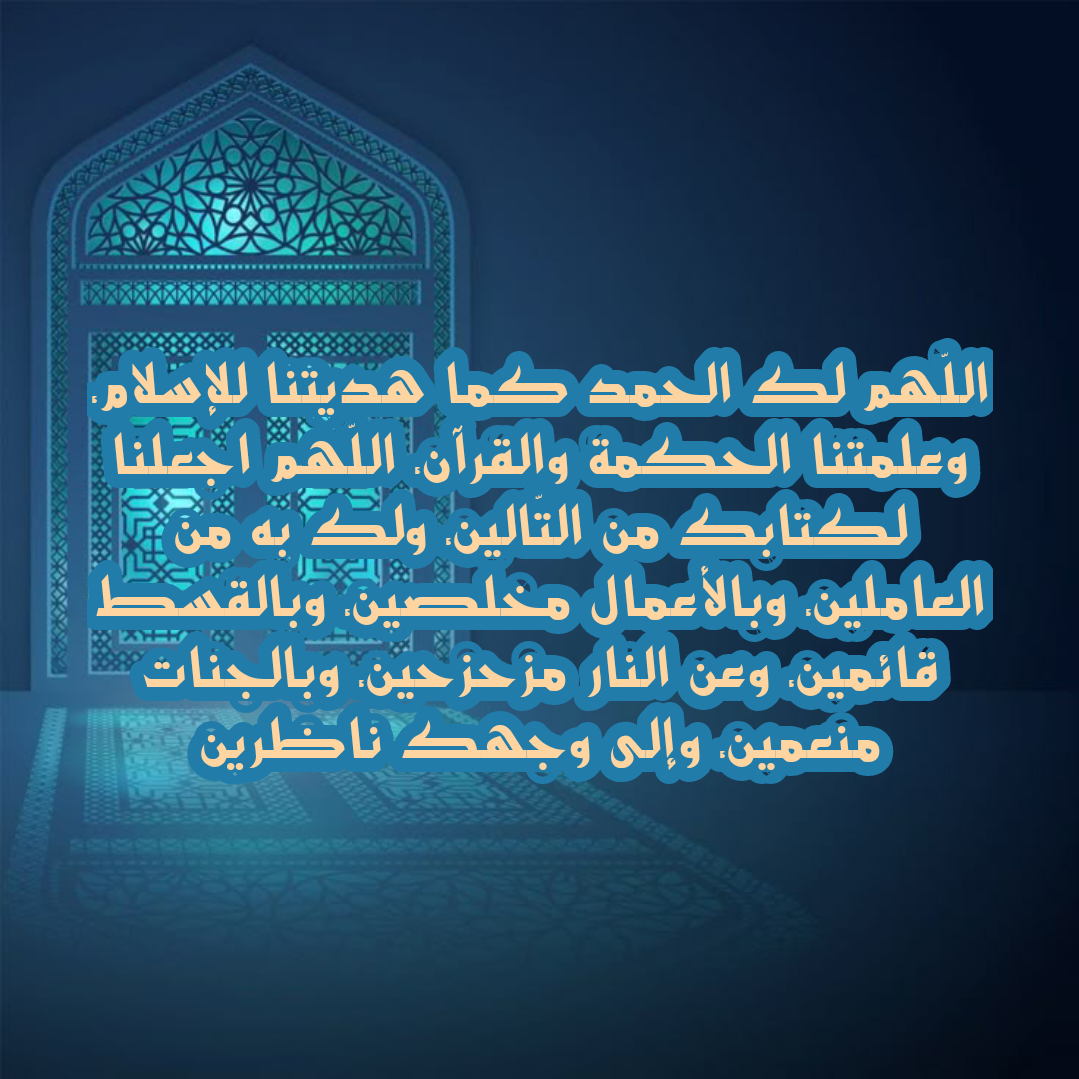 - اللَّهُمَّ أَصْلِحْ لَنَا دِينَنَا الَّذِي هُوَ عِصْمَةُ أَمْرِنَا، وَأَصْلِحْ لَنَا دُنْيَانَا الَّتِي فِيهَا مَعَاشُنَا، وَأَصْلِحْ لَنَا آخِرَتَنَا الَّتِي فِيهَا مَعَادُنَا، وَاجْعَلِ الْحَيَاةَ زِيَادَةً لَنَا فِي كُلِّ خَيْرٍ، وَاجْعَلِ الْمَوْتَ رَاحَةً لَنَا مِنْ كُلِّ شَرٍّ.