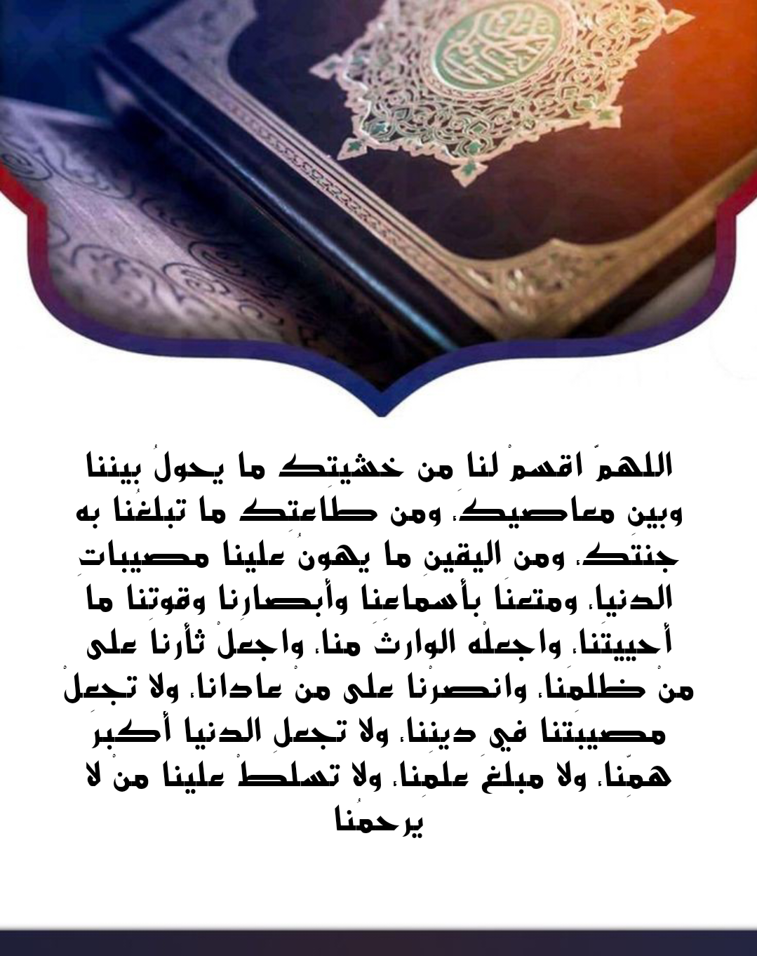 - اللَّهُمَّ اقْسِمْ لَنَا مِنْ خَشْيَتِكَ مَا تَحُولُ بِهِ بَيْنَنَا وَبَيْنَ مَعَاصِيكَ، وَمِنْ طَاعَتِكَ مَا تُبَلِّغُنَا بِهِ جَنَّتَكَ، وَمِنَ الْيَقِينِ مَا تُهَوِّنُ بِهِ عَلَيْنَا مَصَائِبَ الدُّنْيَا.