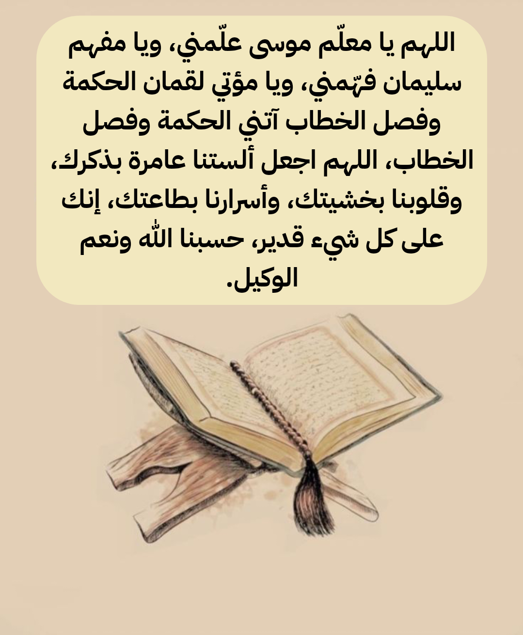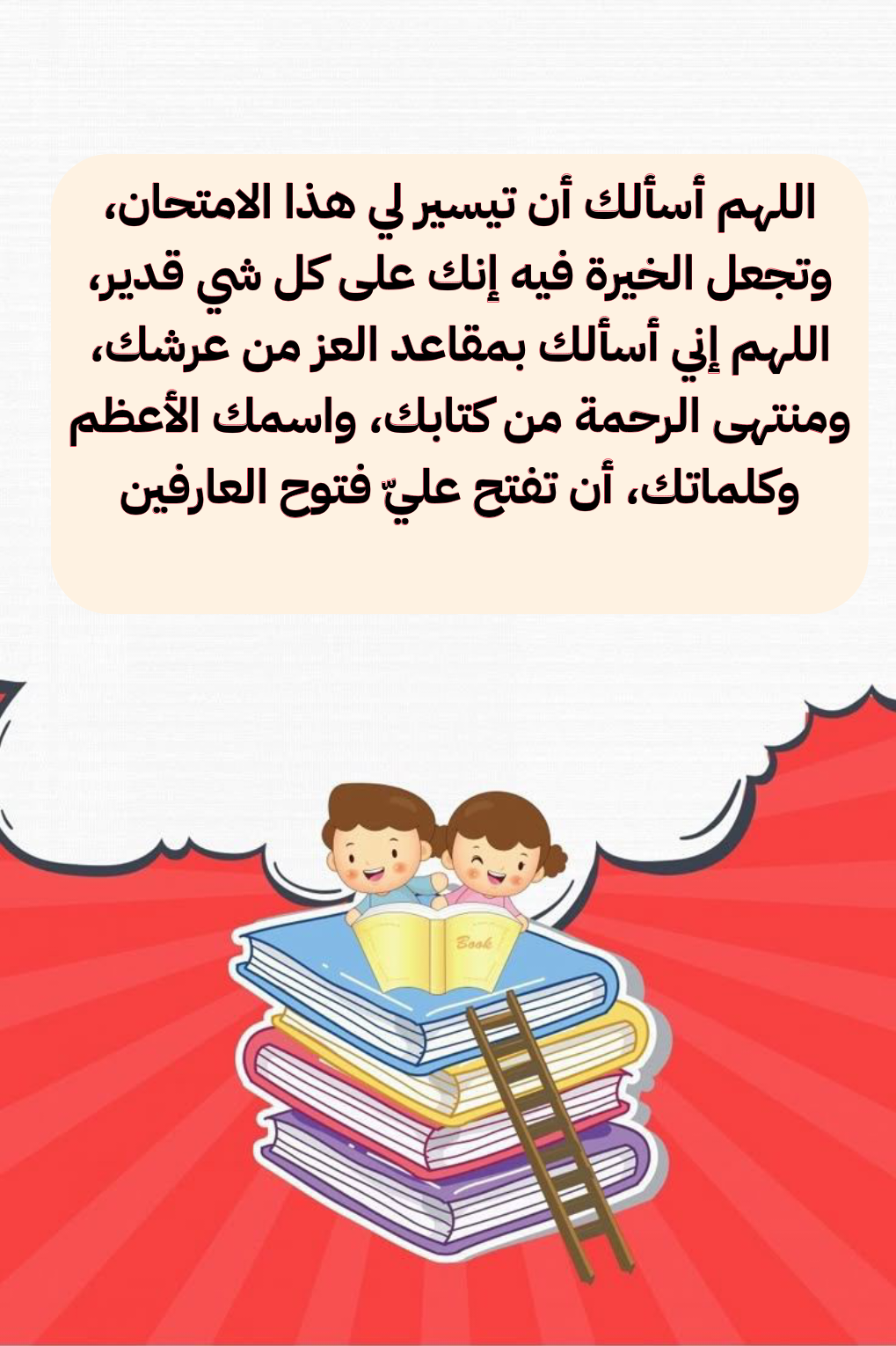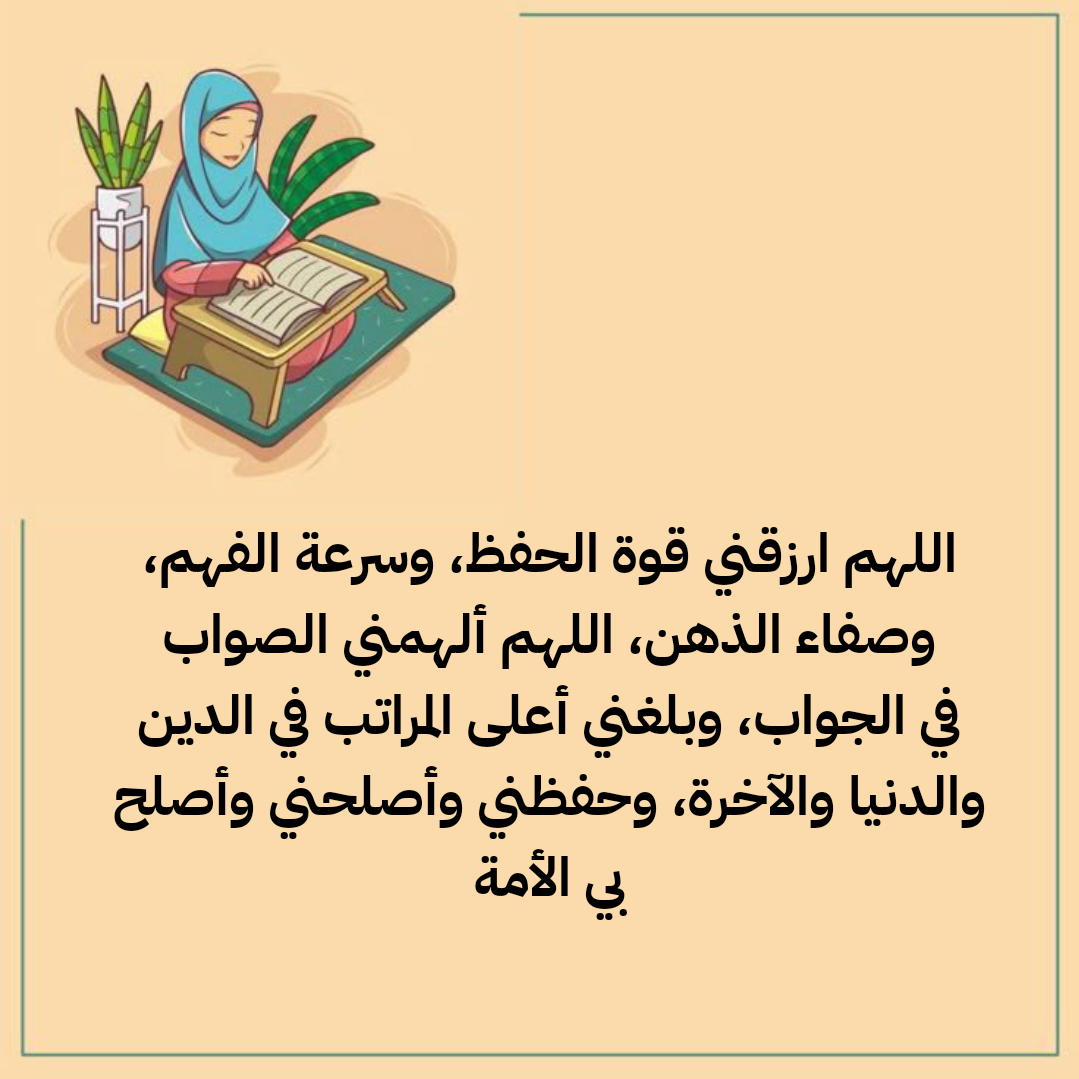 - اللَّهُمَّ ارزقهم قوة الحفظ، وسرعة الفهم، وصفاء الذهن، وألهمهم الإجابة الصحيحة، وبارك لهم في وقتهم وجهدهم.