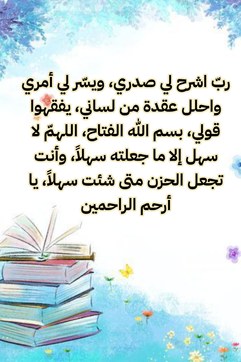 - دعاء موسى عليه السلام لطلب تيسير الأمر: وهو من أنسب الأدعية التي يمكن أن يدعو بها الطالب لتيسير فهمه وقدرته على الإجابة.