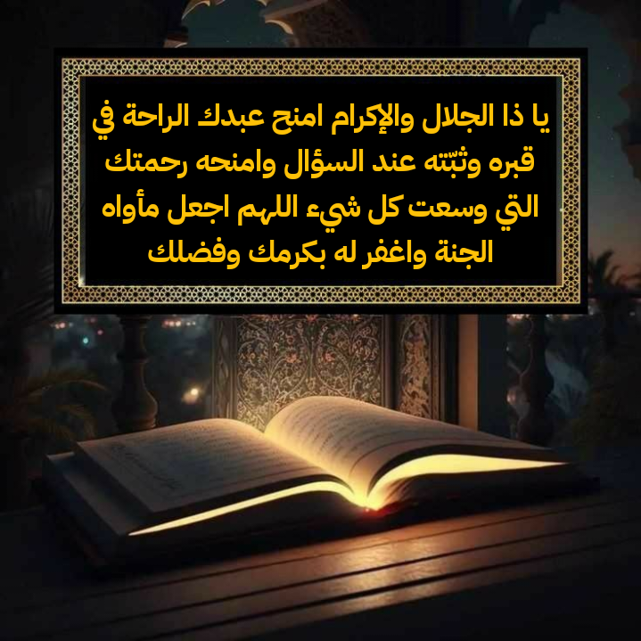 - يَا ذَا الجَلَالِ وَالإِكْرَامِ، ثَبِّتْهُ عِنْدَ السُّؤَالِ، وَآمِنْهُ يَوْمَ الفَزَعِ الأَكْبَرِ، وَاجْعَلْ مَأْوَاهُ الجَنَّةَ بِرَحْمَتِكَ وَفَضْلِكَ يَا أَرْحَمَ الرَّاحِمِينَ.