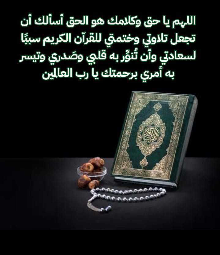 - اللَّهُمَّ يَا مُقَلِّبَ القُلُوبِ، ثَبِّتْ قُلُوبَنَا عَلَى دِينِكَ، وَاجْعَلْ تِلَاوَتَنَا وَخَتْمَتَنَا لِلْقُرْآنِ الكَرِيمِ شَاهِدًا لَنَا يَوْمَ نَلْقَاكَ، وَزَوِّدْنَا بِالإِيمَانِ وَالتَّقْوَى يَا أَرْحَمَ الرَّاحِمِينَ.
