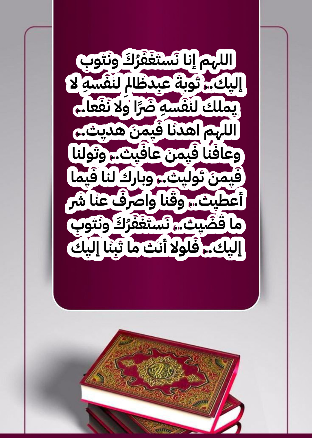 - اللَّهُمَّ إِنَّا نَسْتَغْفِرُكَ وَنَتُوبُ إِلَيْكَ، تَوْبَةَ عَبْدٍ ظَالِمٍ لِنَفْسِهِ لَا يَمْلِكُ لِنَفْسِهِ ضَرًّا وَلَا نَفْعًا، وَلَا مَوْتًا وَلَا حَيَاةً وَلَا نُشُورًا.