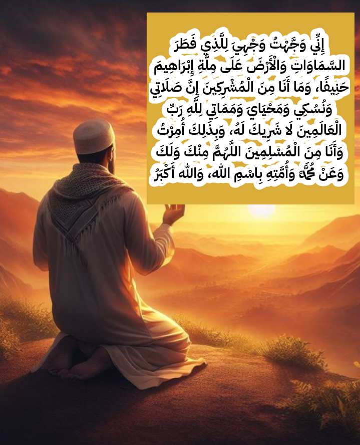 “إِنِّي وَجَّهْتُ وَجْهِيَ لِلَّذِي فَطَرَ السَّمَاوَاتِ وَالْأَرْضَ حَنِيفًا وَمَا أَنَا مِنَ الْمُشْرِكِينَ، إِنَّ صَلَاتِي وَنُسُكِي وَمَحْيَايَ وَمَمَاتِي لِلَّهِ رَبِّ الْعَالَمِينَ لَا شَرِيكَ لَهُ وَبِذَلِكَ أُمِرْتُ وَأَنَا أَوَّلُ الْمُسْلِمِينَ، اللَّهُمَّ مِنْكَ وَلَكَ، عَنْ مُحَمَّدٍ وَأُمَّتِهِ، بِسْمِ اللهِ وَاللهُ أَكْبَرُ، ثُمَّ ذَبَحَ”، (رواه أبو داود، وهو حديث حسن).