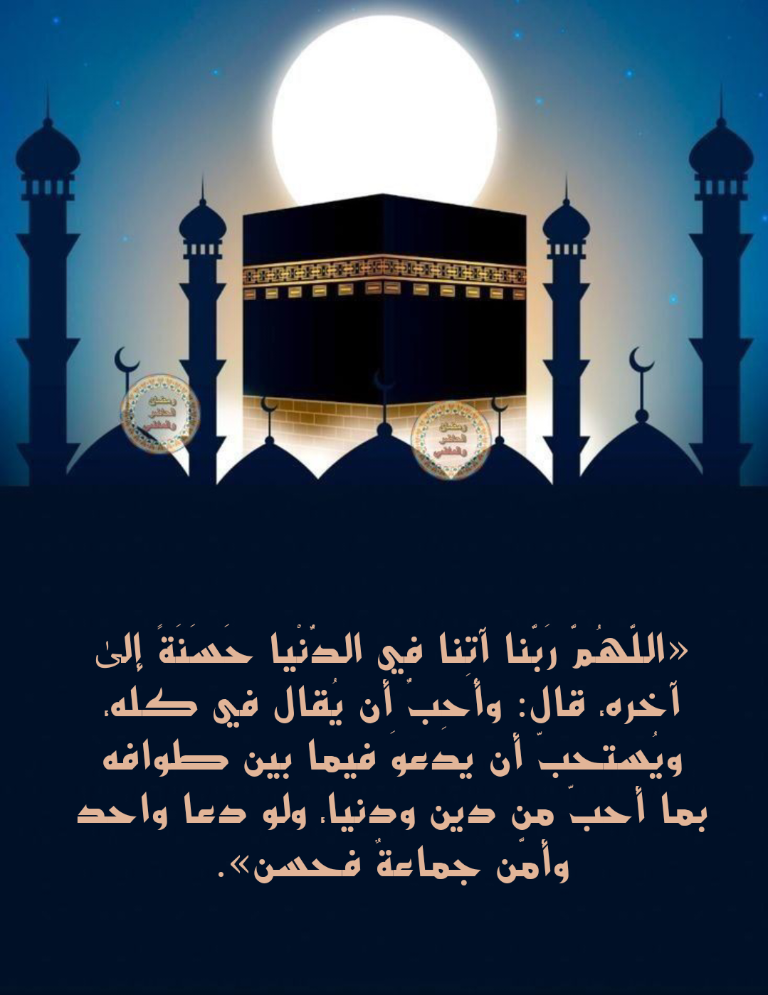 “رَبَّنَا آتِنَا فِي الدُّنْيَا حَسَنَةً وَفِي الْآخِرَةِ حَسَنَةً وَقِنَا عَذَابَ النَّارِ”