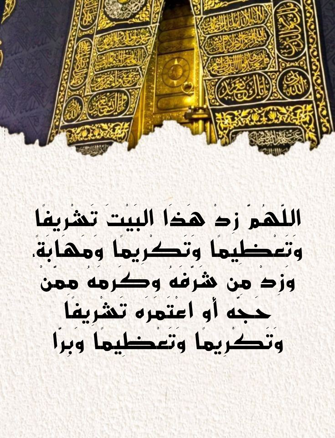 • “اللَّهُمَّ زِدْ هَذَا البَيْتَ تَشْرِيفًا وَتَعْظِيمًا وَتَكْرِيمًا وَمَهَابَةً، وَزِدْ مِنْ شَرَّفَهُ وَكَرَّمَهُ مِمَّنْ حَجَّهُ أَوِ اعْتَمَرَهُ تَشْرِيفًا وَتَكْرِيمًا وَتَعْظِيمًا وَبِرًّا.”.
