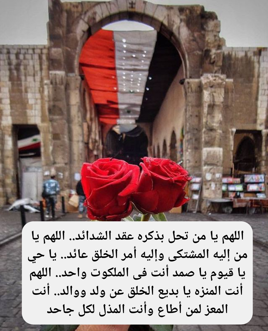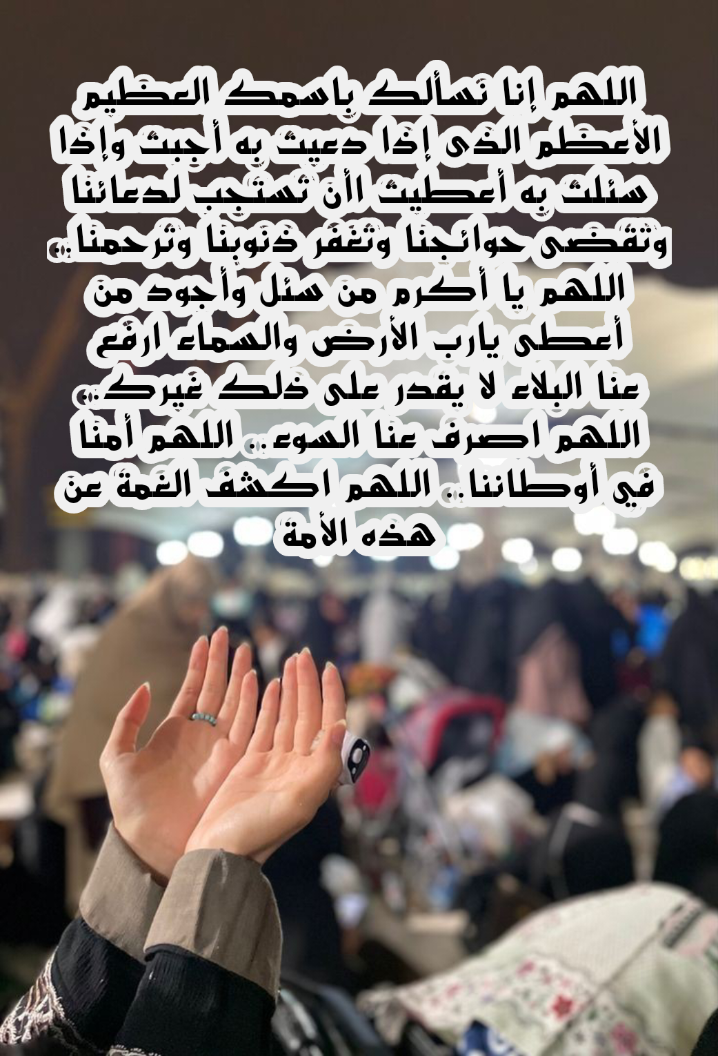• اللَّهُمَّ عَجِّلْ بِفَرَجِكَ عَلَيْنَا، وَأَغِثِ الْعِبَادَ وَالْبِلَادَ، وَاحْفَظْ دِمَاءَ الْمُسْلِمِينَ، وَأَمْنَحْهُمُ الْأَمْنَ وَالْأَمَانَ وَالاسْتِقْرَارَ..