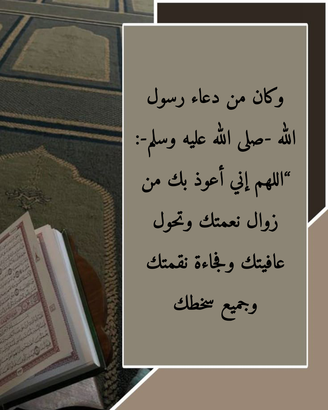 • “اللَّهُمَّ إِنِّي أَعُوذُ بِكَ مِنْ زَوَالِ نِعْمَتِكَ، وَتَحَوُّلِ عَافِيَتِكَ، وَفُجَاءَةِ نِقْمَتِكَ، وَجَمِيعِ سَخَطِكَ”.المصدر: حديث صحيح، رواه مسلم في صحيحه (2739).