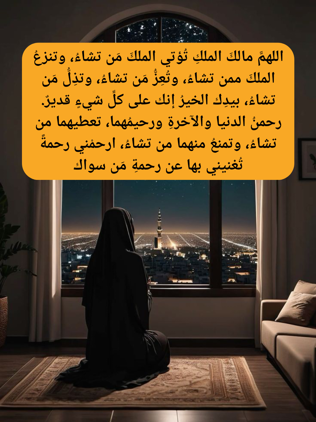 “اللَّهُمَّ اكْفِنِي بِحَلالِكَ عَنْ حَرَامِكَ، وَأَغْنِنِي بِفَضْلِكَ عَمَّنْ سِوَاكَ”