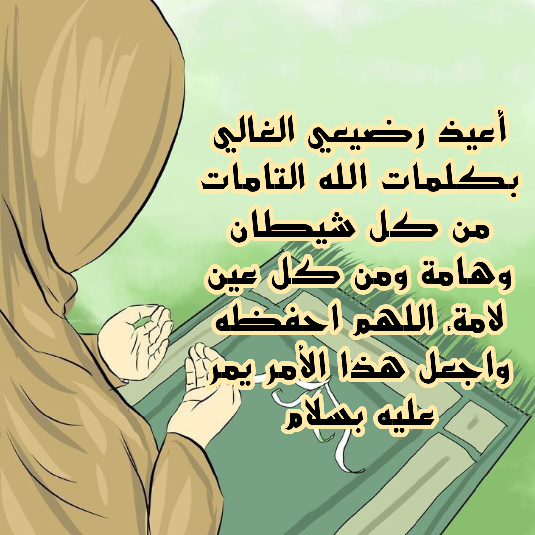 - يَا رَبِّ، اسْتَوْدَعْتُكَ قَلْبَ طِفْلِي وَجَسَدَهُ، فَاحْفَظْهُ بِحِفْظِكَ الَّذِي لا يُرَامُ، وَاكْلَأْهُ بِعَيْنِكَ الَّتِي لا تَنَامُ، وَاجْعَلْ هَذِهِ المَرْحَلَةَ بَرْدًا وَسَلامًا عَلَيْهِ.