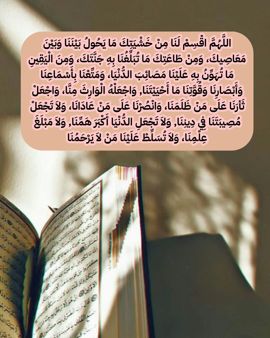 - اللهم ارزقنا من خشيتك ما يكون حاجزًا بيننا وبين معاصيك..، (وهو جزء من دعاء آخر له موضعه الخاص).