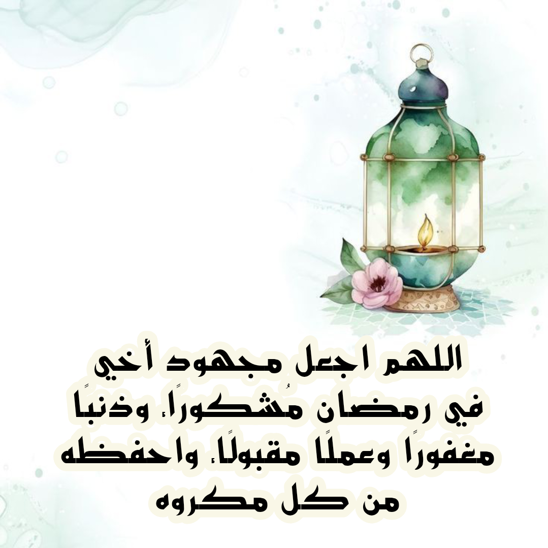 • يَا رَبِّ، بَلِّغْ أَخِي شَهْرَ رَمَضَانَ وَهُوَ فِي أَحْسَنِ حَالٍ، وَاجْعَلْهُ مِنْ عِبَادِكَ المَقْبُولِينَ، وَبَارِكْ لَهُ فِي وَقْتِهِ وَصِحَّتِهِ وَمَالِهِ.