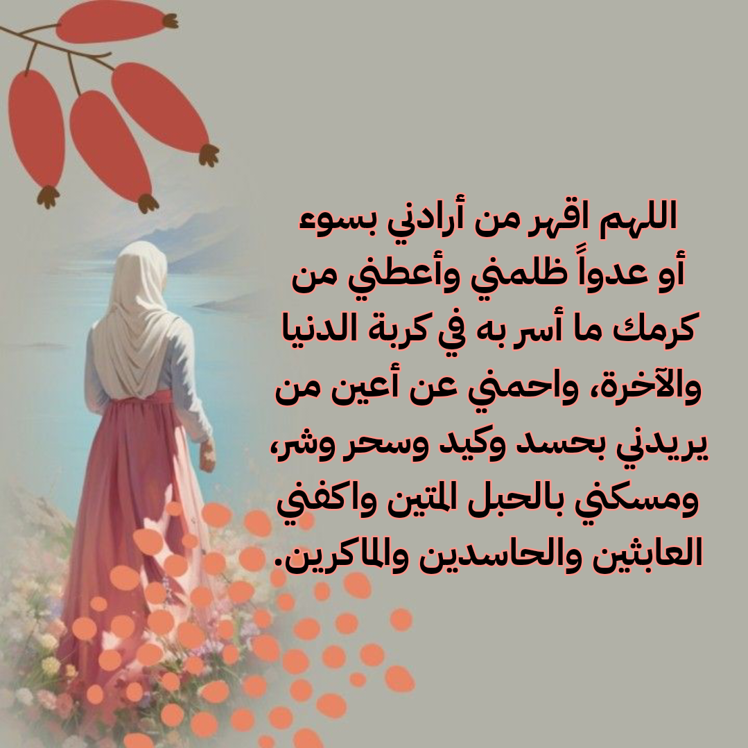 - يَا رَبِّ، كُلُّ مَنْ أَرَادَ بِي سُوءًا فَرُدَّ كَيْدَهُ فِي نَحْرِهِ، وَاجْعَلْ تَدْبِيرَهُ تَدْمِيرًا عَلَيْهِ، وَأَبْعِدْهُ عَنِّي وَعَنْ أَحِبَّتِي، وَاحْمِنِي بِحِفْظِكَ الَّذِي لَا يُرَامُ.
