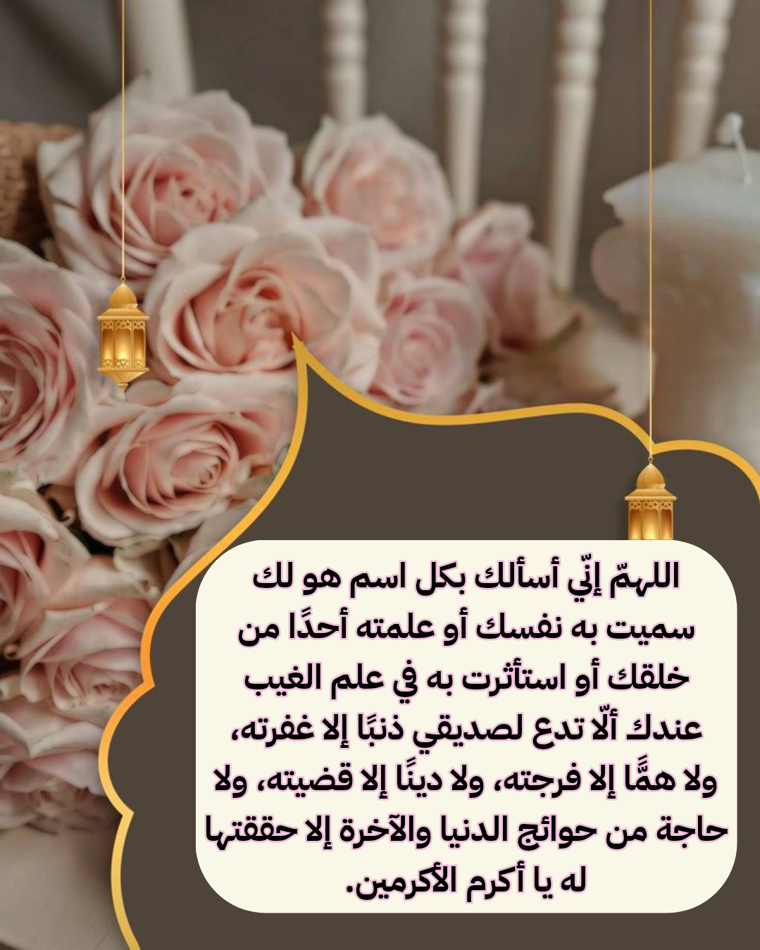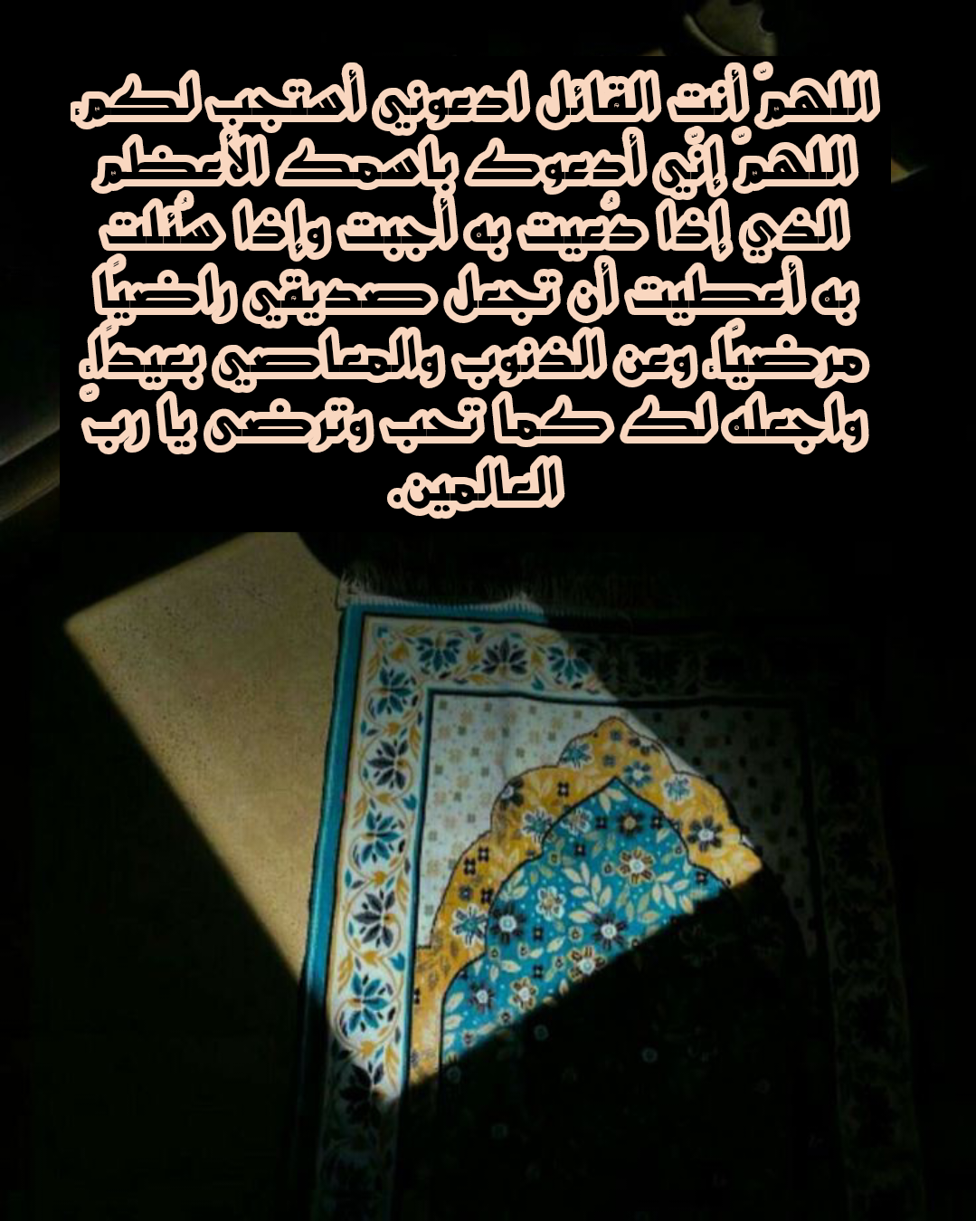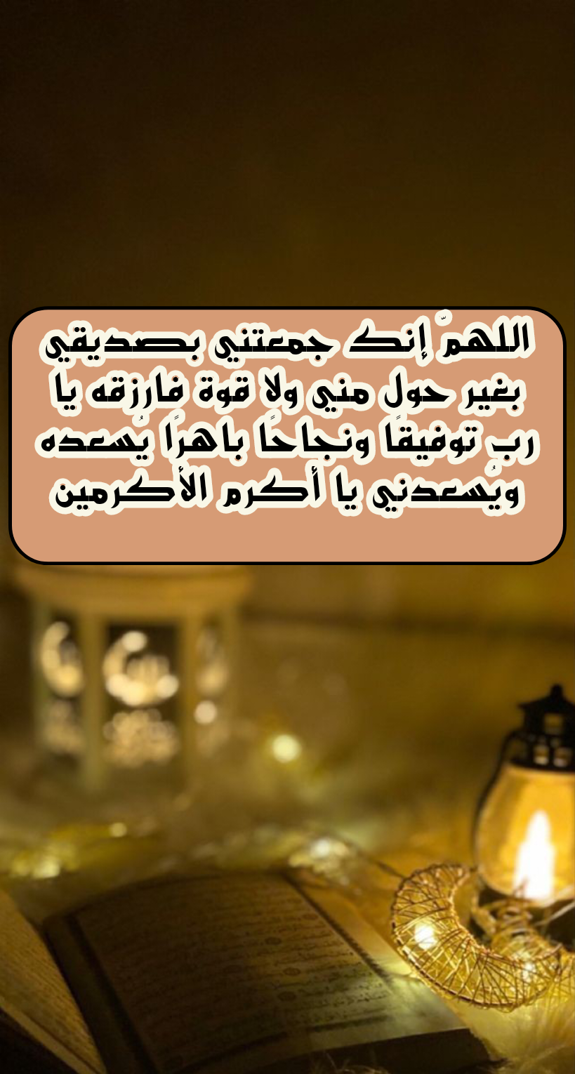 - اللَّهُمَّ إن لي صديقًا عزيزًا على قلبي، فاجعل محبتنا خالصة لوجهك الكريم، واجمعنا دومًا على الخير والبر، وتحت لواء نبيك ﷺ يوم نلقاك، وارزقنا من رحمتك وعفوك يا أكرم الأكرمين.