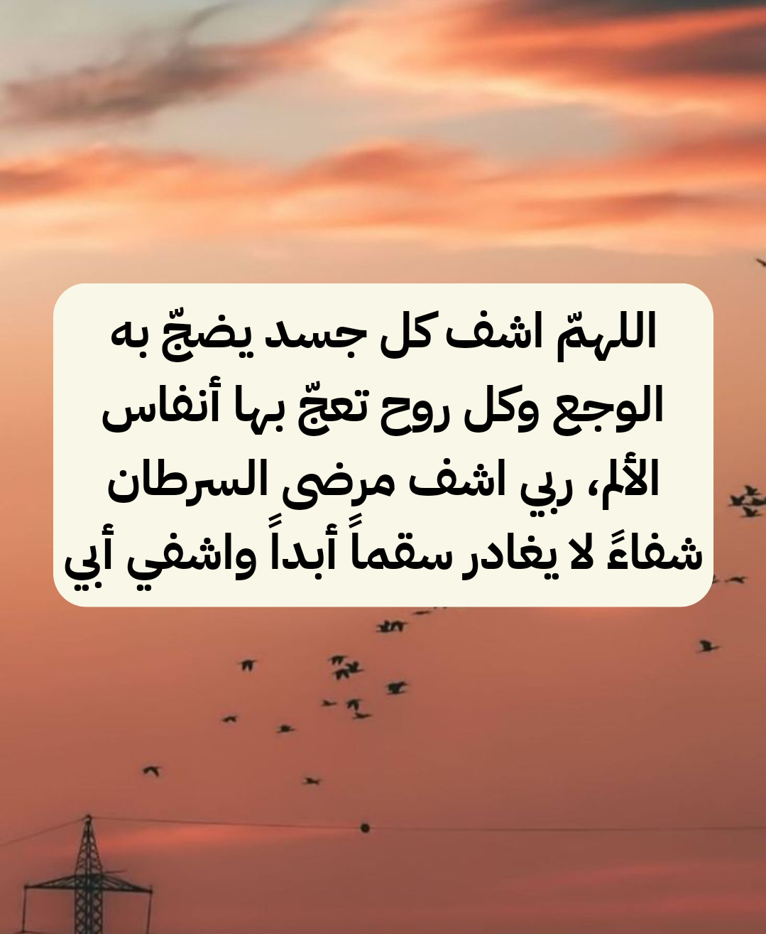 - اللَّهُمَّ إِنَّا نَسْأَلُكَ بِأَسْمَائِكَ الحُسْنَى وَصِفَاتِكَ العُلَا، وَبِرَحْمَتِكَ الَّتِي وَسِعَتْ كُلَّ شَيْءٍ، أَنْ تَمُنَّ عَلَيْنَا بِالشِّفَاءِ التَّامِّ، وَأَلَّا تَدَعَ فِي أَجْسَادِنَا أَلَمًا إِلَّا أَذْهَبْتَهُ، وَلَا سُقْمًا إِلَّا عَافَيْتَهُ، وَأَنْ تُلْبِسَنَا ثِيَابَ الصِّحَّةِ وَالعَافِيَةِ عَاجِلًا غَيْرَ آجِلٍ يَا أَرْحَمَ الرَّاحِمِينَ.