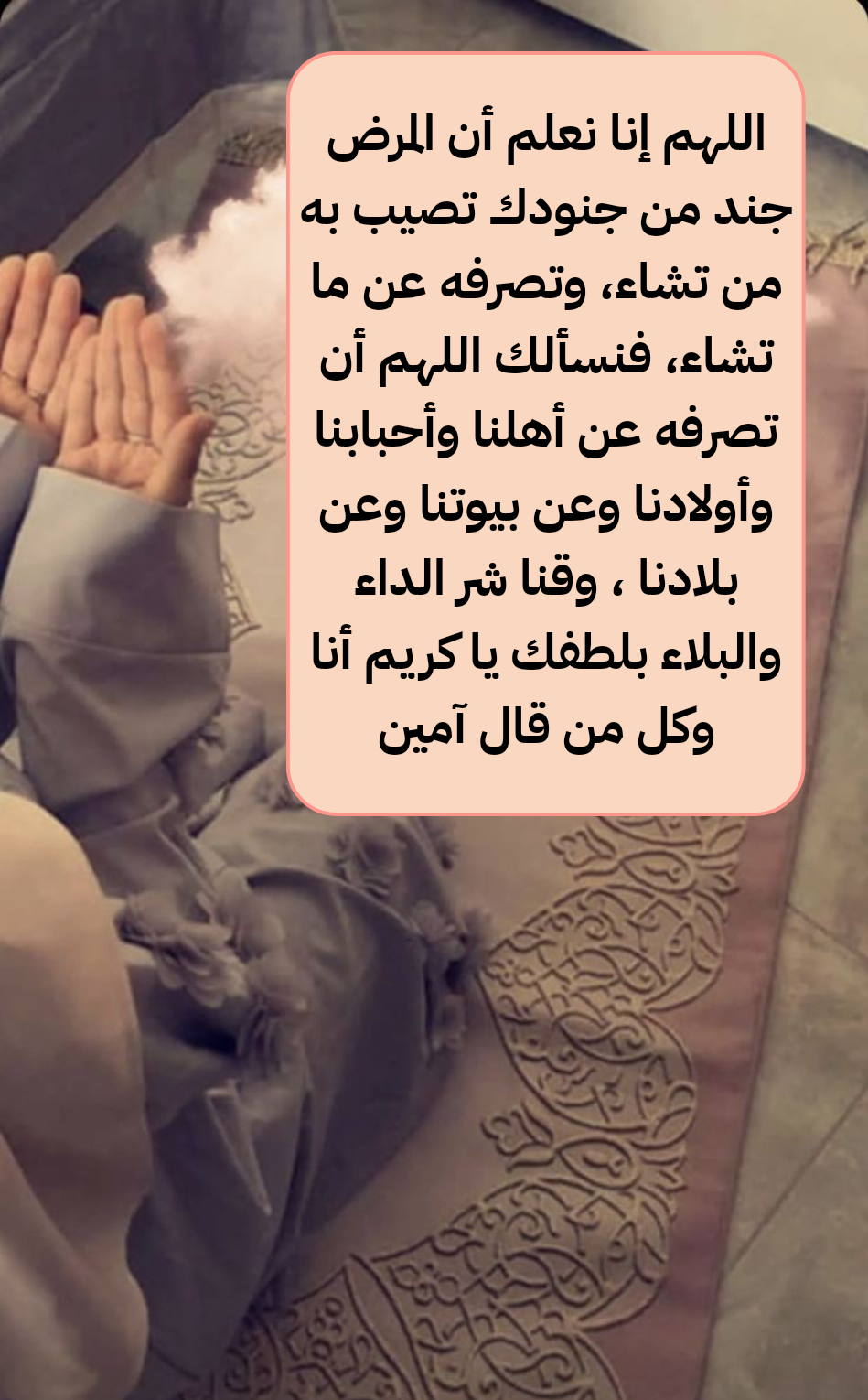 - إِلَهِي، لَا مَلْجَأَ لَنَا إِلَّا إِلَيْكَ، فَتَوَلَّنَا بِرَحْمَتِكَ، وَاشْفِ كُلَّ مَرِيضٍ وَعَافِهِ، وَرُدَّهُ إِلَى أَهْلِهِ سَالِمًا مُعَافًى، إِنَّكَ عَلَى كُلِّ شَيْءٍ قَدِيرٌ.