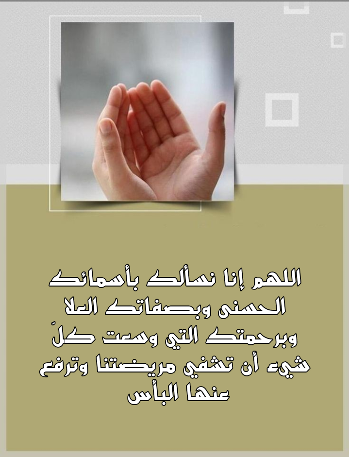 - يا الله، نسألك بأسمائك الحسنى وصفاتك العليا أن تمنّ على كل مريض بالشفاء، وأن ترفع عنهم البلاء، وتلبسهم لباس العافية.