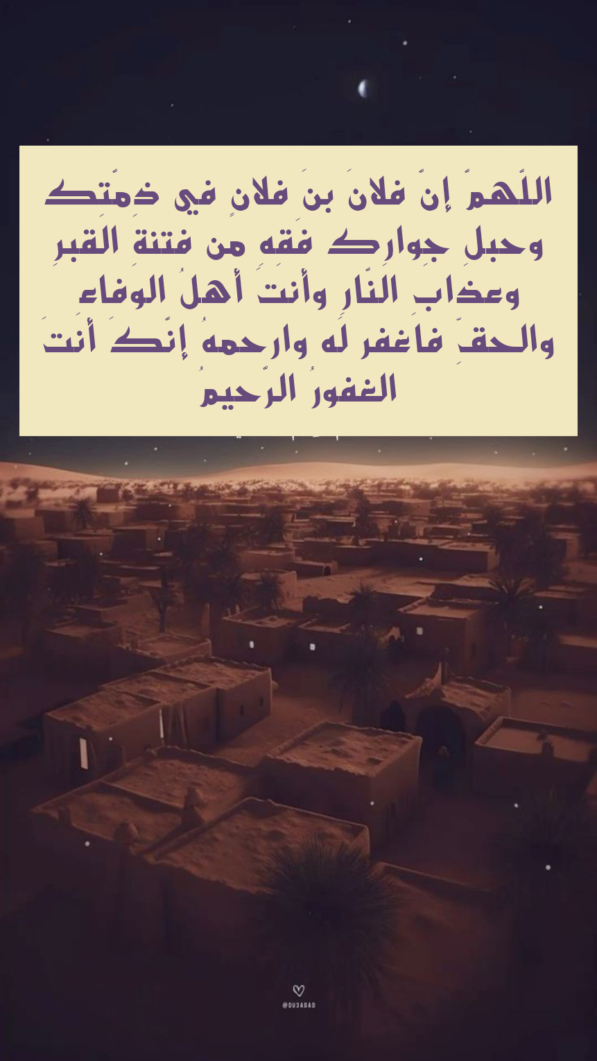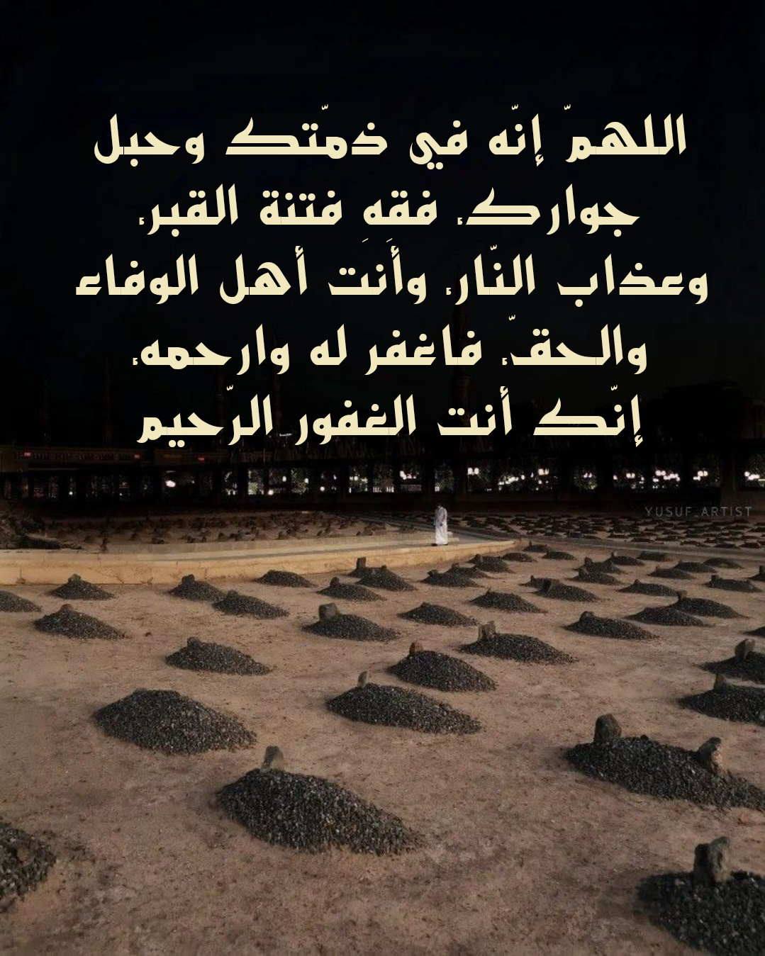 - اللَّهُمَّ آنس وحشته، ووسّع قبره، وأنِر له فيه، واجعله من أهل الفردوس الأعلى يا أكرم الأكرمين.