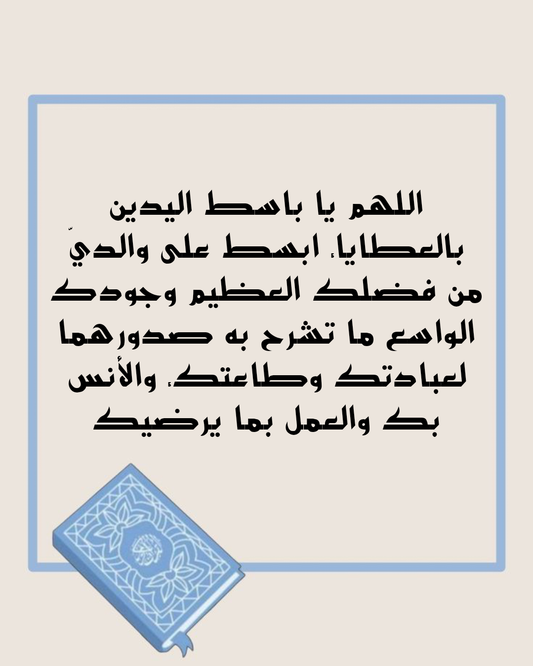 - اللَّهُمَّ أَسْعِدْ قُلُوبَ وَالِدَيَّ، وَاجْعَلِ الطُّمَأْنِينَةَ تُرَافِقُ دُرُوبَهُمَا، وَبَارِكْ فِي أَعْمَارِهِمَا وَأَعْمَالِهِمَا، وَاجْعَلْهُمَا مِنْ أَهْلِ الْفِرْدَوْسِ الْأَعْلَى..