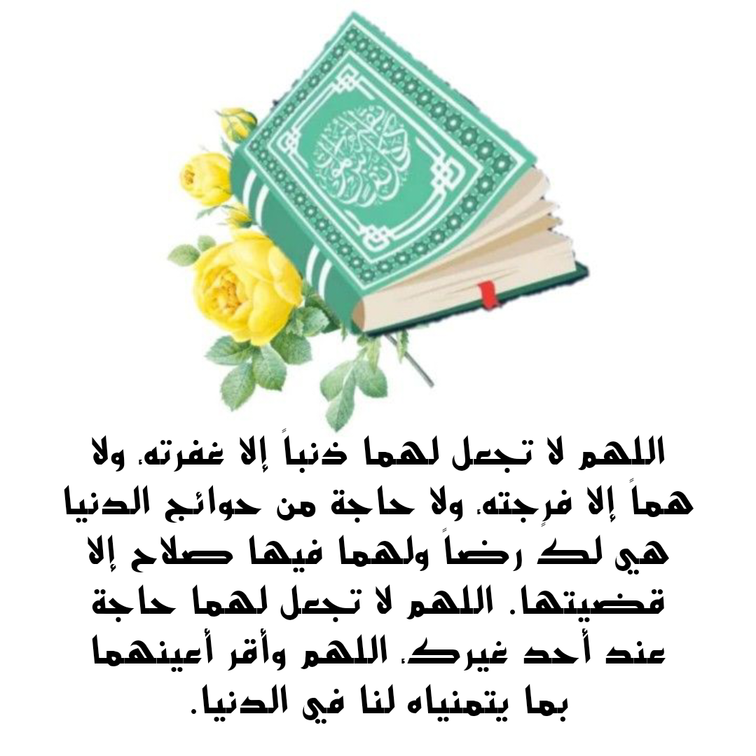 - اللَّهُمَّ اغْفِرْ لَهُمَا جَمِيعَ مَا مَضَى مِنْ ذُنُوبِهِمَا، وَاعْصِمْهُمَا فِيمَا بَقِيَ مِنْ أَعْمَارِهِمَا، وَارْزُقْهُمَا عَمَلًا صَالِحًا زَكِيًّا تَرْضَى بِهِ عَنْهُمَا..