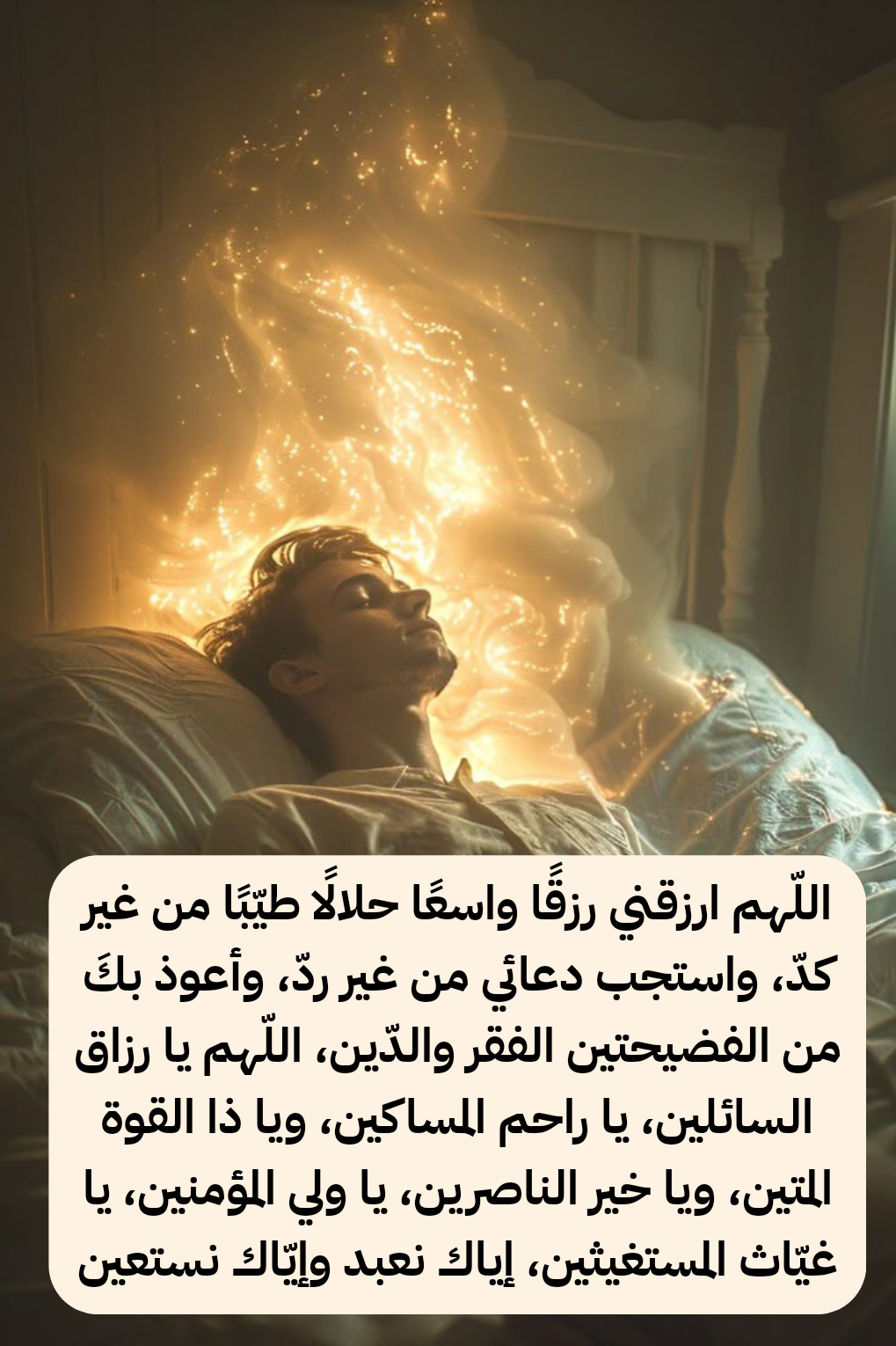 - إِلَهِي، أَدْعُوكَ دُعَاءَ مَنِ اشْتَدَّتْ فَاقَتُهُ، وَضَعُفَتْ قُوَّتُهُ، وَقَلَّتْ حِيلَتُهُ، دُعَاءَ الْغَرِيقِ الْمُضْطَرِّ، أَسْأَلُكَ يَا اللهُ أَنْ تَرْزُقَنِي رِزْقًا حَلَالًا طَيِّبًا، وَأَنْ تُفَرِّجَ عَنِّي كُلَّ ضِيقٍ، وَتَقْضِيَ حَاجَتِي، وَتُغْنِيَنِي بِحَلَالِكَ عَنْ حَرَامِكَ.