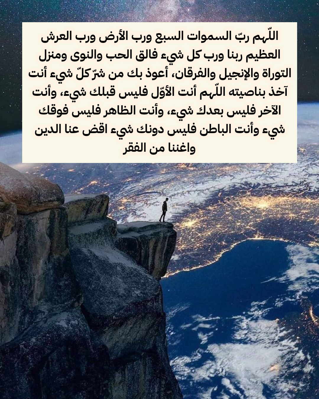 - اللَّهُمَّ يَا رَبَّ السَّمَاوَاتِ السَّبْعِ وَرَبَّ الْأَرْضِ، وَرَبَّ الْعَرْشِ الْعَظِيمِ، رَبَّنَا وَرَبَّ كُلِّ شَيْءٍ، فَالِقَ الْحَبِّ وَالنَّوَى، وَمُنْزِلَ التَّوْرَاةِ وَالْإِنْجِيلِ وَالْفُرْقَانِ، أَعُوذُ بِكَ مِنْ شَرِّ كُلِّ شَيْءٍ أَنْتَ آخِذٌ بِنَاصِيَتِهِ، اللَّهُمَّ أَنْتَ الْأَوَّلُ فَلَيْسَ قَبْلَكَ شَيْءٌ، وَأَنْتَ الْآخِرُ فَلَيْسَ بَعْدَكَ شَيْءٌ، وَأَنْتَ الظَّاهِرُ فَلَيْسَ فَوْقَكَ شَيْءٌ، وَأَنْتَ الْبَاطِنُ فَلَيْسَ دُونَكَ شَيْءٌ، اقْضِ عَنَّا الدَّيْنَ، وَأَغْنِنَا مِنَ الْفَقْرِ. (رواه مسلم).