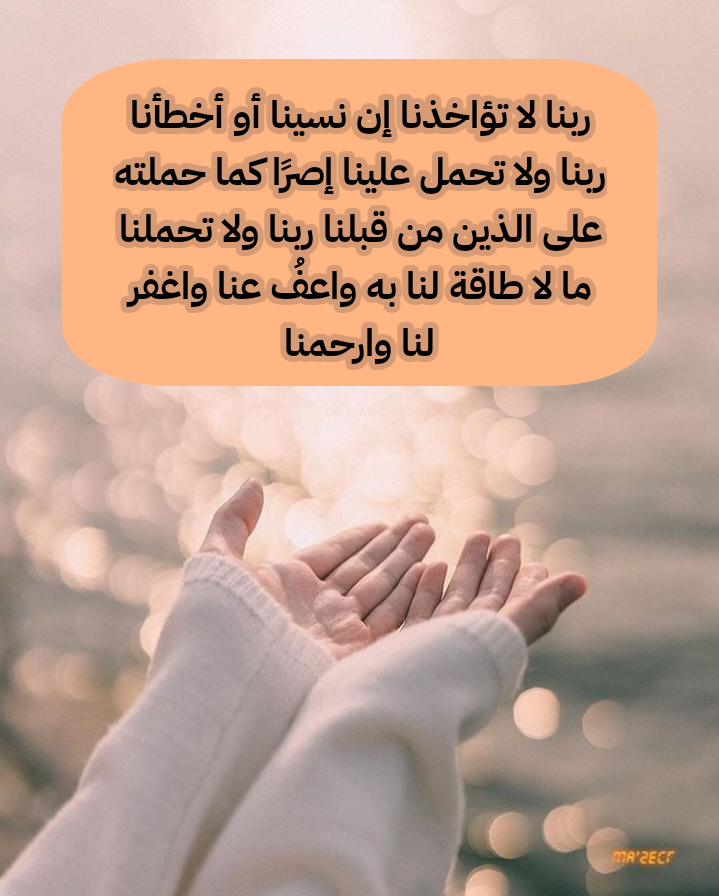 “رَبَّنَا لَا تُؤَاخِذْنَا إِن نَّسِينَا أَوْ أَخْطَأْنَا ۚ رَبَّنَا وَلَا تَحْمِلْ عَلَيْنَا إِصْرًا كَمَا حَمَلْتَهُ عَلَى الَّذِينَ مِن قَبْلِنَا ۚ رَبَّنَا وَلَا تُحَمِّلْنَا مَا لَا طَاقَةَ لَنَا بِهِ ۖ وَاعْفُ عَنَّا وَاغْفِرْ لَنَا وَارْحَمْنَا ۚ أَنتَ مَوْلَانَا فَانصُرْنَا عَلَى الْقَوْمِ الْكَافِرِينَ”