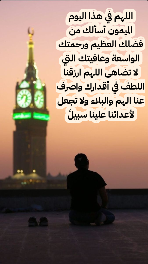- يَا رَبِّ، فِي هَذَا اليَوْمِ المُبَارَكِ، اجْعَلْ لَنَا فِيهِ مِنْ كَرَمِكَ وَفَضْلِكَ نَصِيبًا، وَلَا تَحْرِمْنَا خَيْرَ مَا عِنْدَكَ بِسُوءِ مَا عِنْدَنَا.