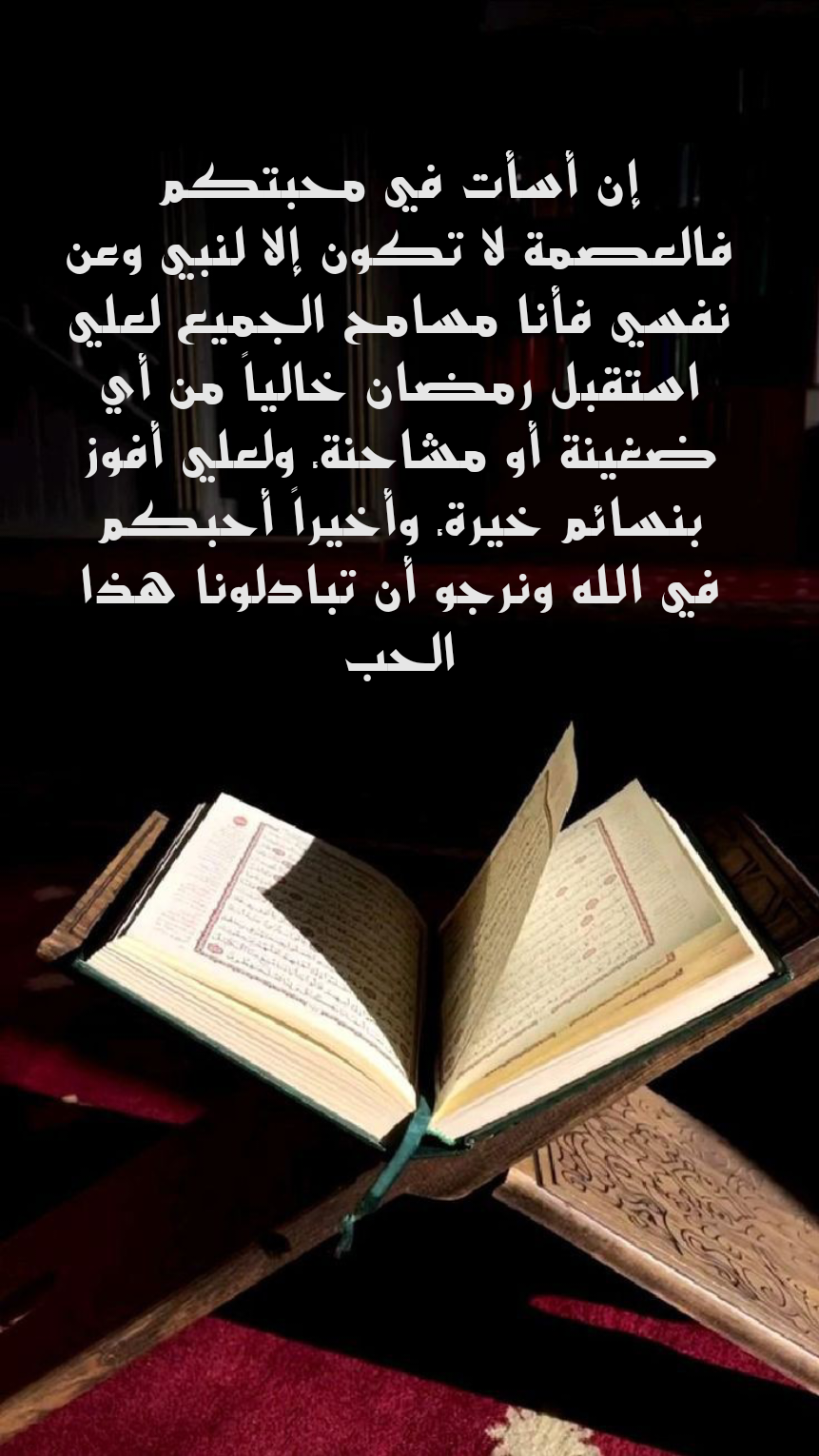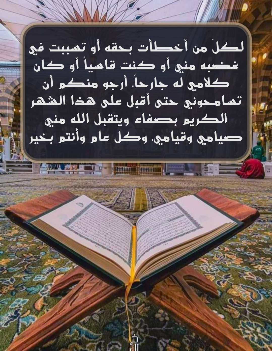 - اللهم بلغنا رمضان وقد طهرت قلوبنا من الشحناء والبغضاء، أرسل إليكم هذه الرسالة راجياً الصفح والمسامحة عن أي زلل أو تقصير، ولنبدأ معاً صفحة بيضاء في هذا الشهر الكريم.