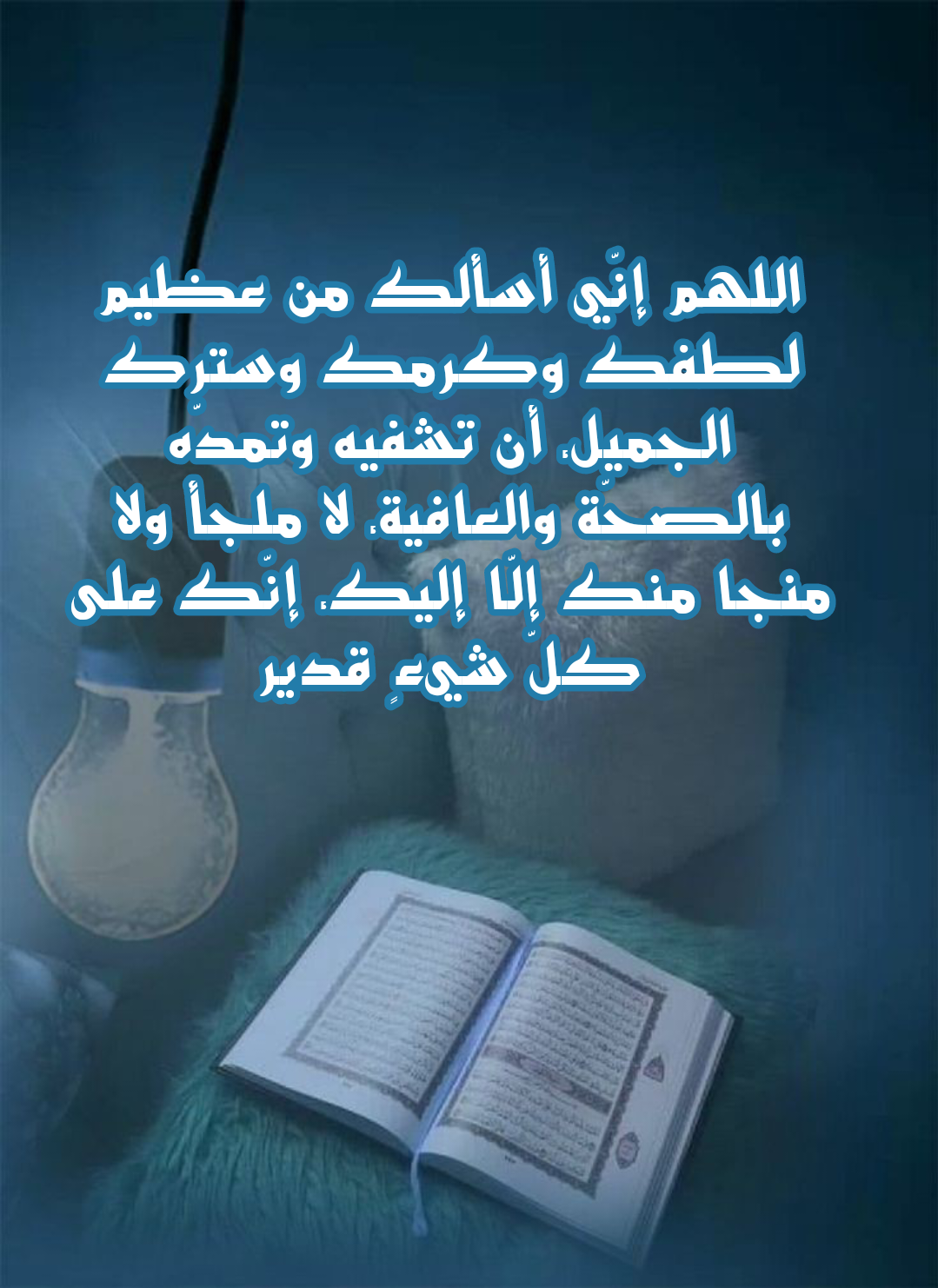 - أَسْأَلُ اللهَ الْعَظِيمَ، رَبَّ الْعَرْشِ الْعَظِيمِ، أَنْ يَشْفِيَنِي وَيَشْفِيَ مَرْضَى الْمُسْلِمِينَ.