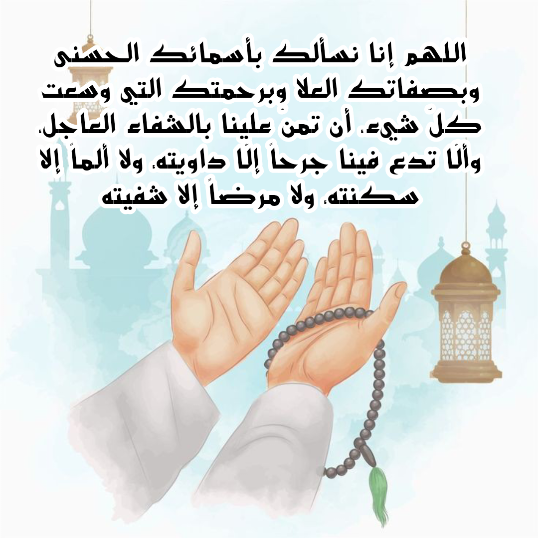 - اللَّهُمَّ يَا مُفَرِّجَ الْكُرُوبِ، وَيَا كَاشِفَ الْهُمُومِ، وَيَا سَامِعَ كُلِّ شَكْوَى، أَسْأَلُكَ بِاسْمِكَ الشَّافِي أَنْ تُنْزِلَ شِفَاءً مِنْ عِنْدِكَ عَلَى كُلِّ مَرِيضٍ، وَأَنْ تَرْفَعَ عَنَّا الْبَلَاءَ وَالْوَبَاءَ بِرَحْمَتِكَ يَا أَرْحَمَ الرَّاحِمِينَ.