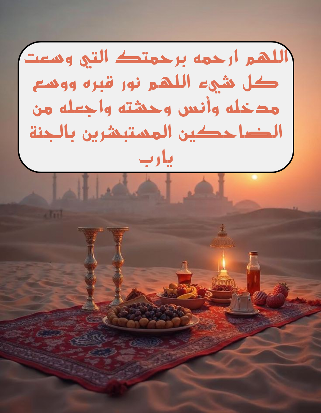 • اللَّهُمَّ كما بلَّغتنا رمضان، نسألك أن ترحمَ من لم يُكتب لهم بلوغُه، وأن تجعلَ لهم في كلِّ دعوةٍ منّا رحمةً ونورًا وسرورًا إلى يومِ يُبعثون.