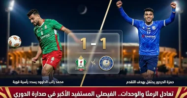 حسم التعادل الإيجابي بنتيجة (1-1) قمة مباريات اليوم الثلاثاء 10 مارس 2026 (الموافق 21 رمضان 1447 هـ) بين الرمثا والوحدات، في اللقاء الذي أقيم على ستاد الحسن بإربد ضمن ختام منافسات الجولة التاسعة عشرة من الدوري الأردني للمحترفين، هذا التعادل جاء بمثابة “هدية” للمتصدر نادي الفيصلي الذي ابتعد بفارق مريح عن ملاحقيه.