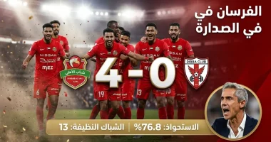 كشفت إحصائيات اللقاء عن تفوق كاسح لكتيبة “الفرسان” على مدار الشوطين، وجاءت الأرقام كالتالي: