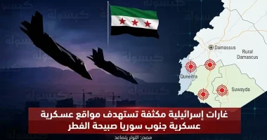 في تطور ميداني متسارع تزامن مع صبيحة أول أيام عيد الفطر المبارك، شن سلاح الجو الإسرائيلي فجر اليوم الجمعة 20 مارس 2026 (1 شوال 1447 هـ) سلسلة غارات جوية مكثفة استهدفت مواقع عسكرية تابعة للحكومة السورية في المنطقة الجنوبية، وأسفرت الهجمات عن تدمير مراكز حيوية، وسط تحذيرات إسرائيلية شديدة اللهجة من استمرار التصعيد في حال تعرضت المكونات السكانية في الجنوب السوري لأي خطر.