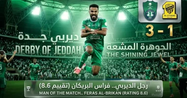 خطف الدولي السعودي فراس البريكان، مهاجم النادي الأهلي، الأضواء في “ديربي العروس” أمام الاتحاد، بعدما سجل حضوراً طاغياً منحه الأفضلية الفنية المطلقة في المواجهة التي أقيمت اليوم الأحد 8 مارس 2026، ضمن منافسات الجولة الـ25 من دوري روشن السعودي للمحترفين 1447هـ.