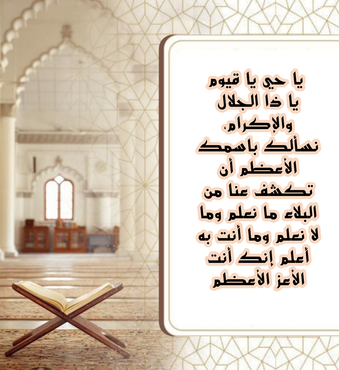 • اللَّهُمَّ اجْعَلْ خِتَامَ شَعْبَانَ غُفْرَانًا لِذُنُوبِنَا، وَبِدَايَةَ رَمَضَانَ نُورًا لِقُلُوبِنَا، وَبَلِّغْنَا إِيَّاهُ وَنَحْنُ فِي أَفْضَلِ حَالٍ، وَاجْعَلْنَا مِمَّنْ يَنَالُونَ بَرَكَةَ عِبَادَتِكَ وَسَكِينَةَ الْإِيمَانِ.