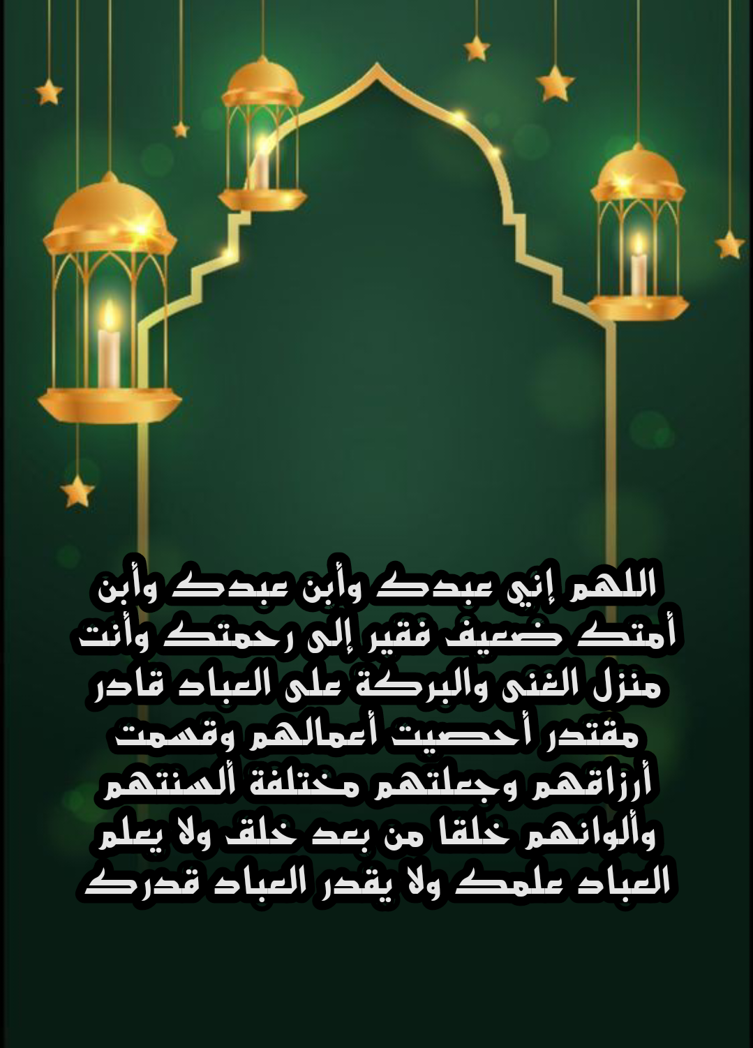 • اللَّهُمَّ إِنِّي عَبْدُكَ ابْنُ عَبْدِكَ ابْنُ أَمَتِكَ، نَاصِيَتِي بِيَدِكَ، مَاضٍ فِيَّ حُكْمُكَ، عَدْلٌ فِيَّ قَضَاؤُكَ، أَسْأَلُكَ بِكُلِّ اسْمٍ هُوَ لَكَ..، أَنْ تَجْعَلَ الْقُرْآنَ رَبِيعَ قَلْبِي، وَنُورَ صَدْرِي، وَجَلَاءَ حُزْنِي، وَذَهَابَ هَمِّي، (هذا جزء من دعاء الكرب الثابت في السنة).