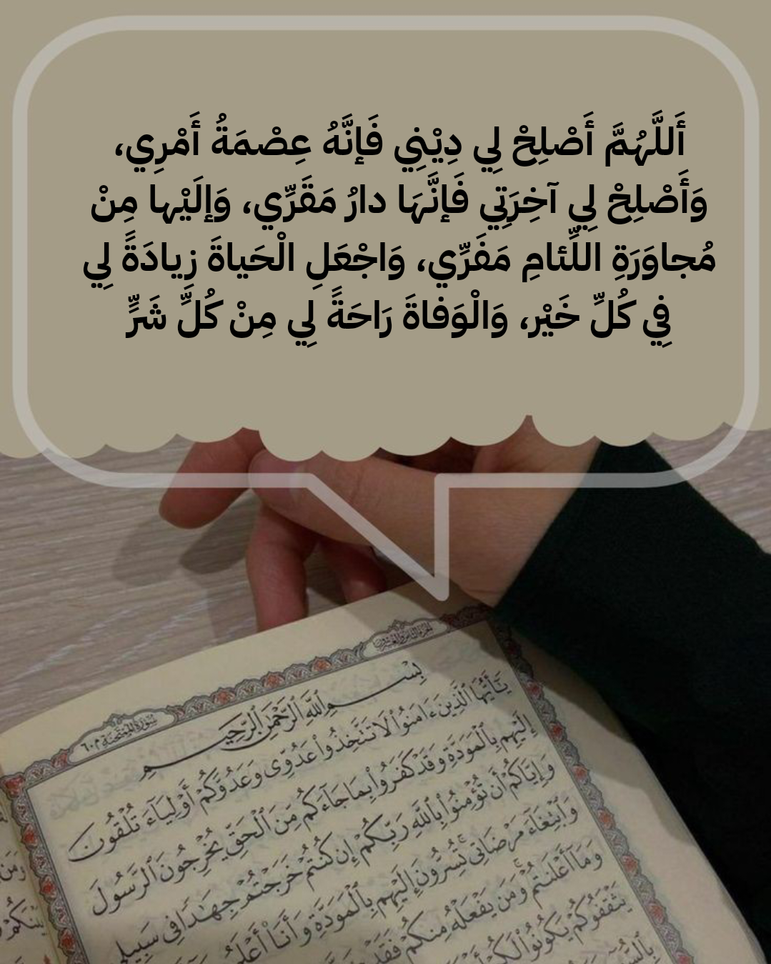 - “اللَّهُمَّ اجْعَلِ الْإِسْلَامَ مُعَزَّزًا وَالْمُسْلِمِينَ مَنْصُورِينَ، وَأَتْمِمْ لَنَا نُورَنَا، وَارْضَ عَنَّا يَا كَرِيمُ، وَثَبِّتْ قُلُوبَنَا عَلَى طَاعَتِكَ، وَاجْعَلْنَا مِنْ عِبَادِكَ الصَّالِحِينَ الَّذِينَ يَتَّبِعُونَ سُنَّةَ نَبِيِّكَ مُحَمَّدٍ صَلَّى اللَّهُ عَلَيْهِ وَسَلَّمَ.”.