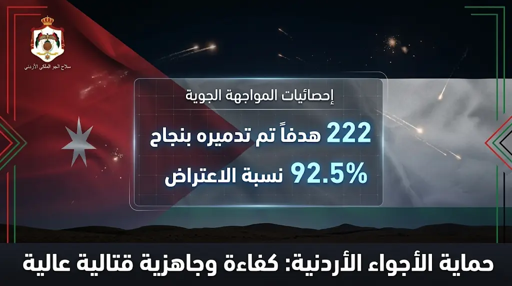 - إجمالي الأهداف المرصودة: 240 صاروخاً وطائرة مسيرة أُطلقت باتجاه الأراضي الأردنية منذ اندلاع الحرب.