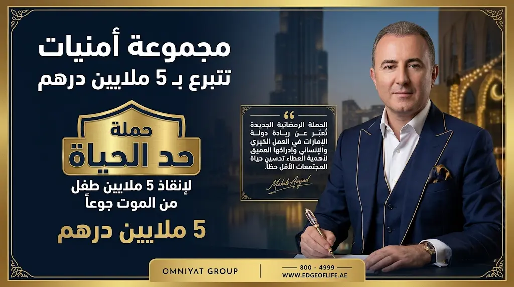في خطوة تعزز قيم التكافل الإنساني خلال الأيام المباركة من شهر رمضان 1447هـ، أعلنت “مجموعة أمنيات” العقارية اليوم، الأربعاء 11 مارس 2026، عن تقديم دعم مالي سخي بقيمة 5 ملايين درهم لصالح حملة “حد الحياة” العالمية.