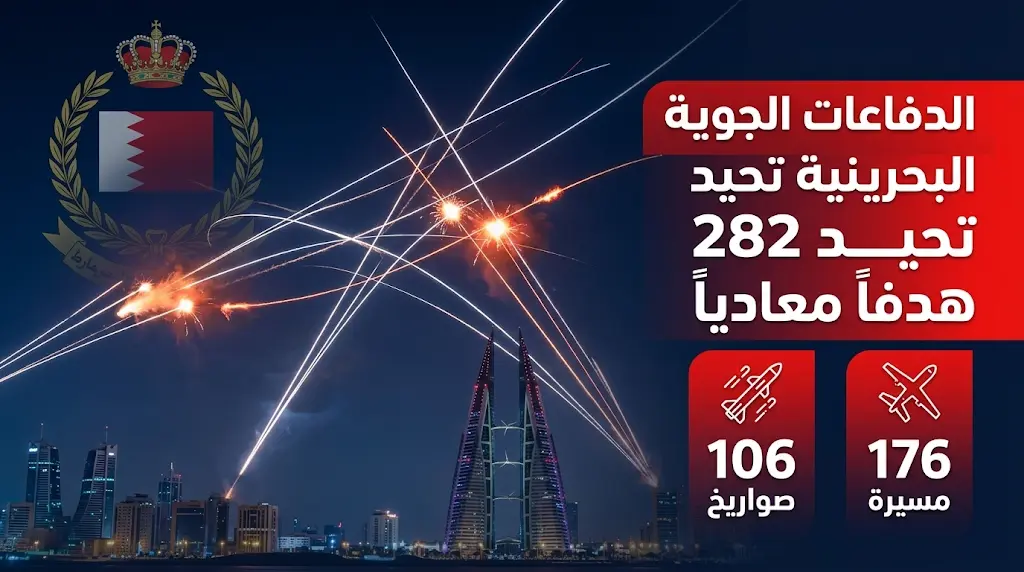 قوة دفاع البحرين تعلن اعتراض 282 هدفاً جوياً وتدمير 106 صواريخ باليستية و176 طائرة مسيرة بنجاح