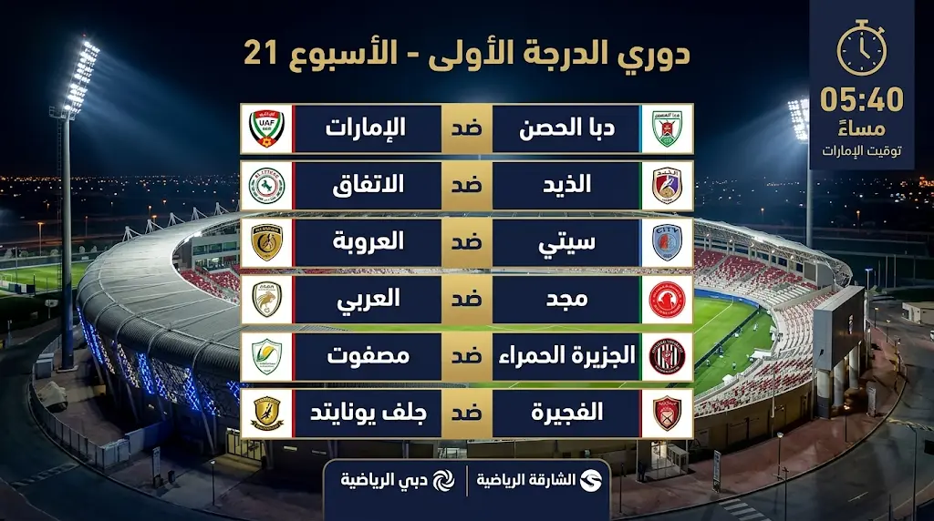 تتجه أنظار عشاق كرة القدم الإماراتية غداً الأحد، 22 مارس 2026، إلى ملاعب دوري الدرجة الأولى، حيث تُقام 6 مباريات قوية في توقيت واحد ضمن منافسات الأسبوع الحادي والعشرين، وتكتسب هذه الجولة أهمية كبرى في ظل الصراع المشتعل على مراكز المقدمة وتحسين الترتيب، خاصة مع انفراد فريق “يونايتد” بالصدارة بفارق مريح عن أقرب ملاحقيه.